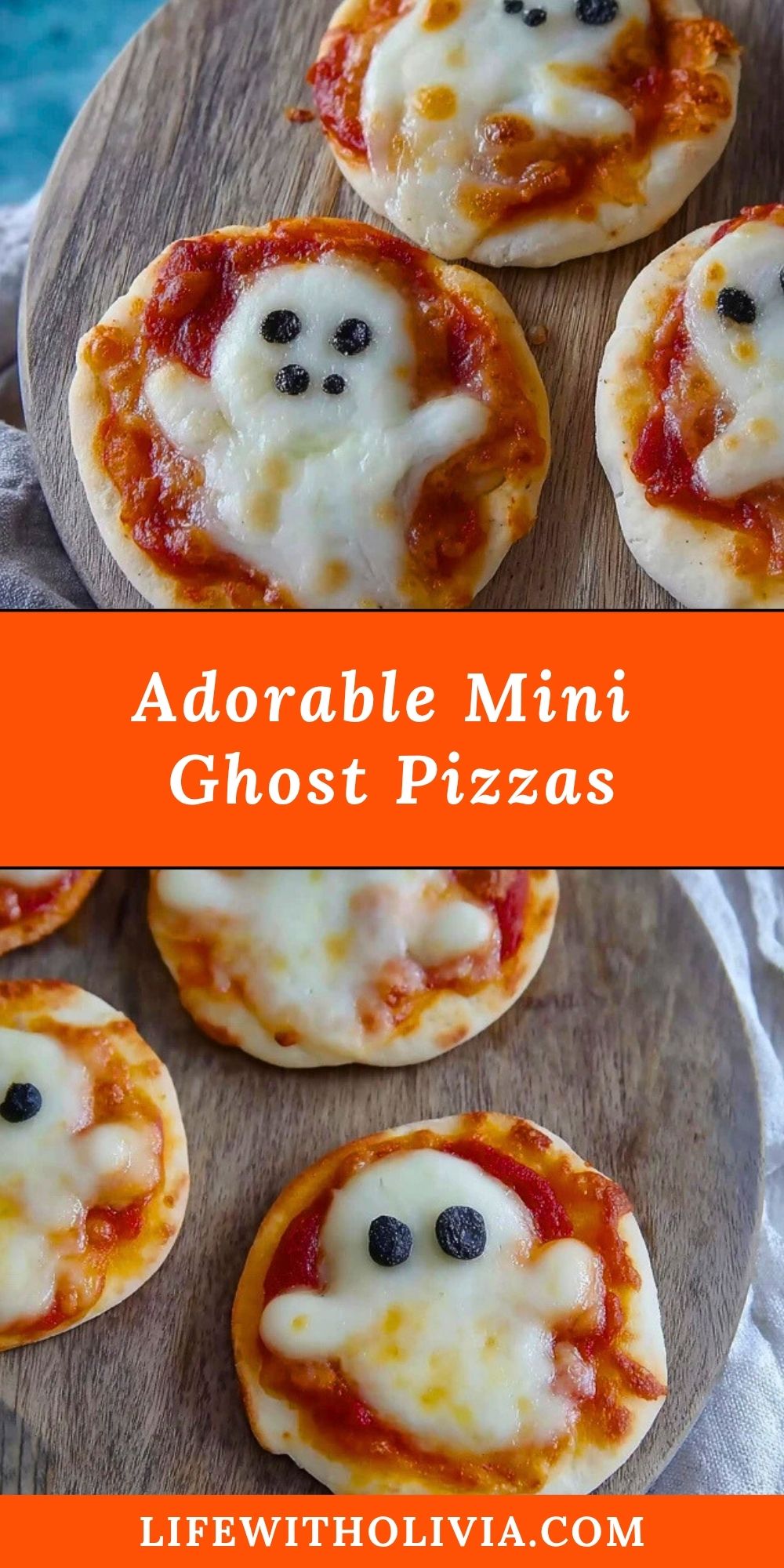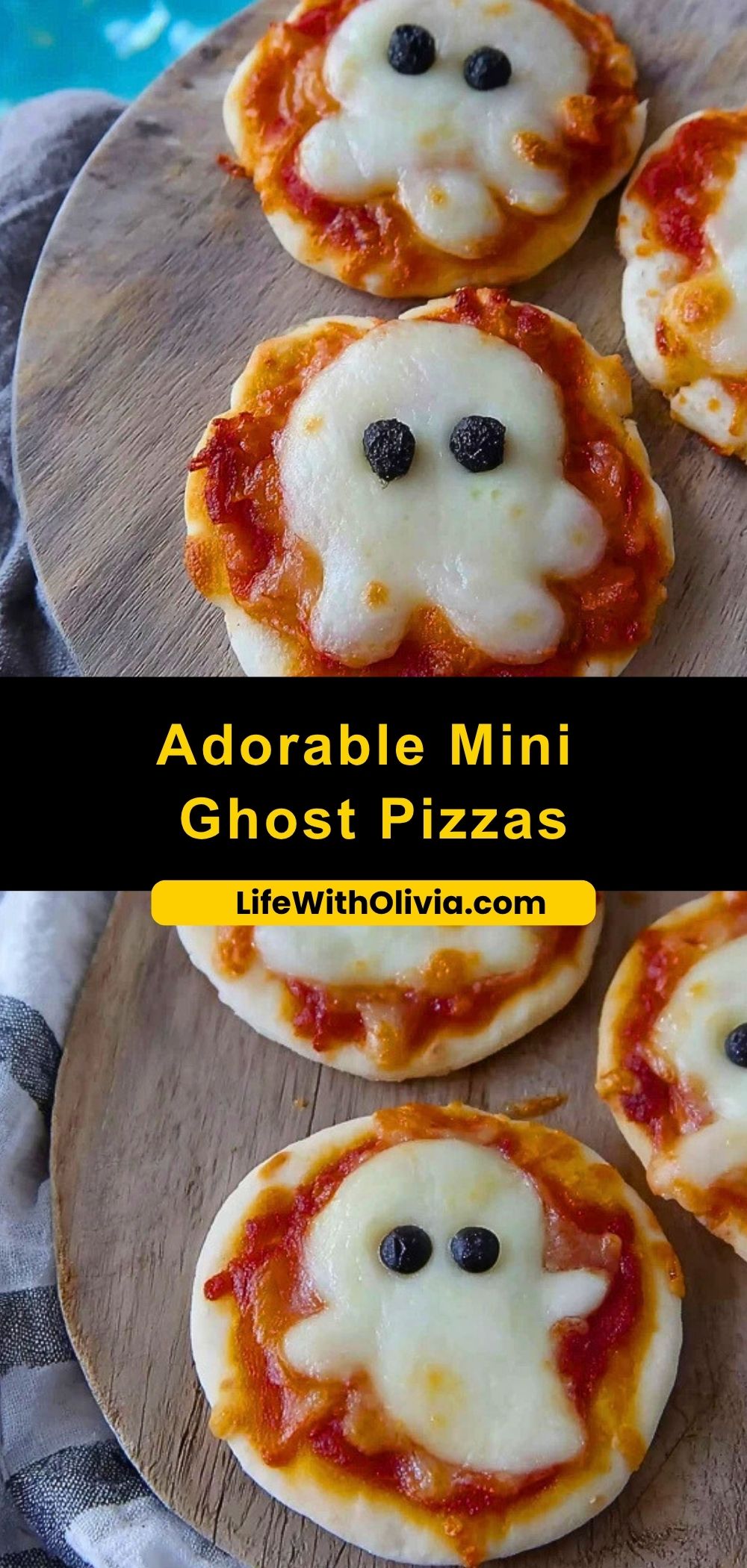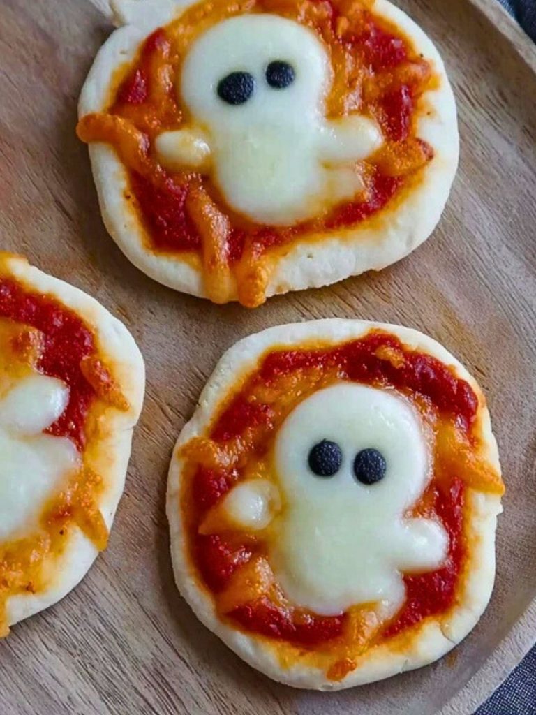 Keywords: Halloween Pizza, Ghost Snacks, Mini Pizza, Kids Party, Mozzarella Ghosts