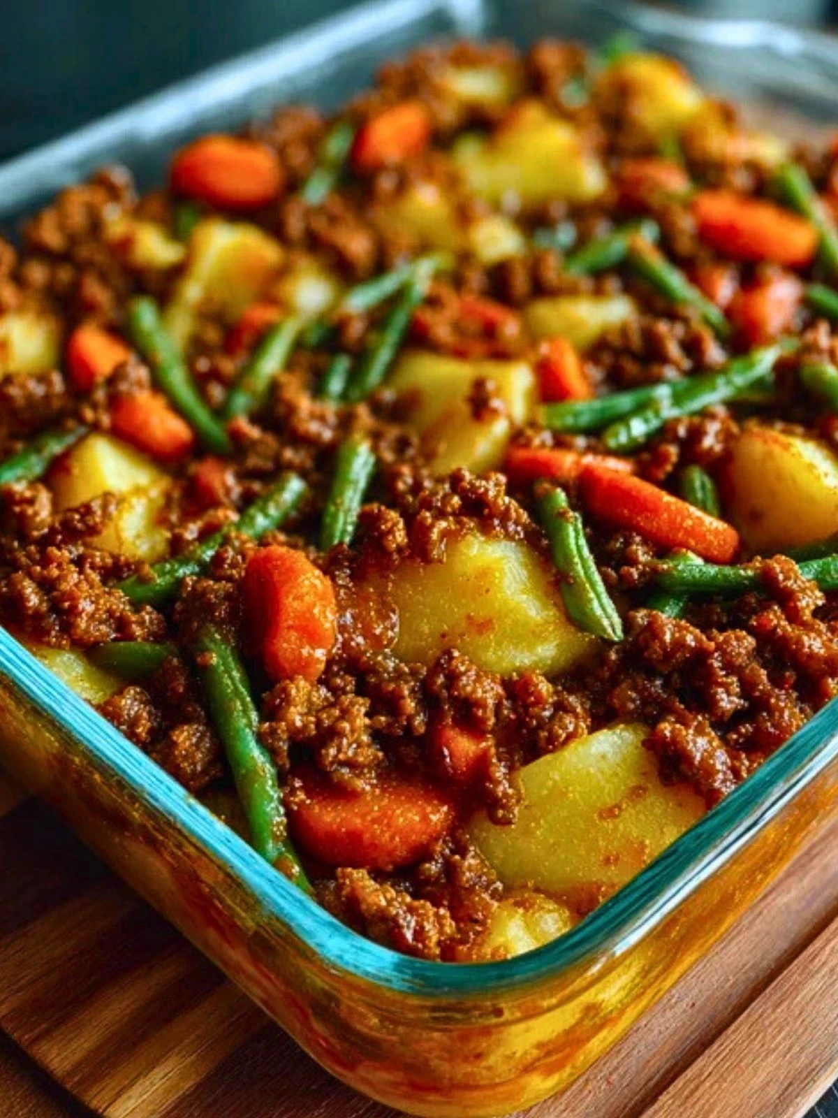 In a greased 9×13″ baking dish, layer the potatoes, carrots, and green beans. Pour the meat mixture over the top and gently mix to distribute everything evenly.