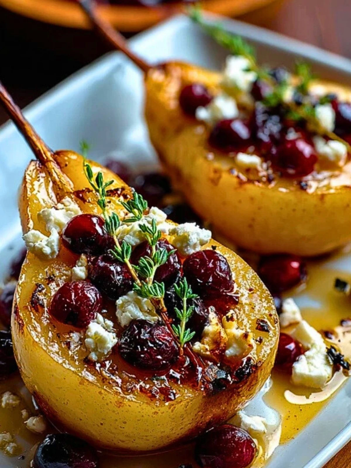 This dish pairs minimal ingredients with bold contrast—soft and juicy fruit meets tangy cheese, with the added pop of cranberry brightness and a finish of herbal earthiness from thyme. It’s one of those dishes that impresses visually and on the palate with little effort, making it perfect for festive entertaining or quiet fall evenings at home.