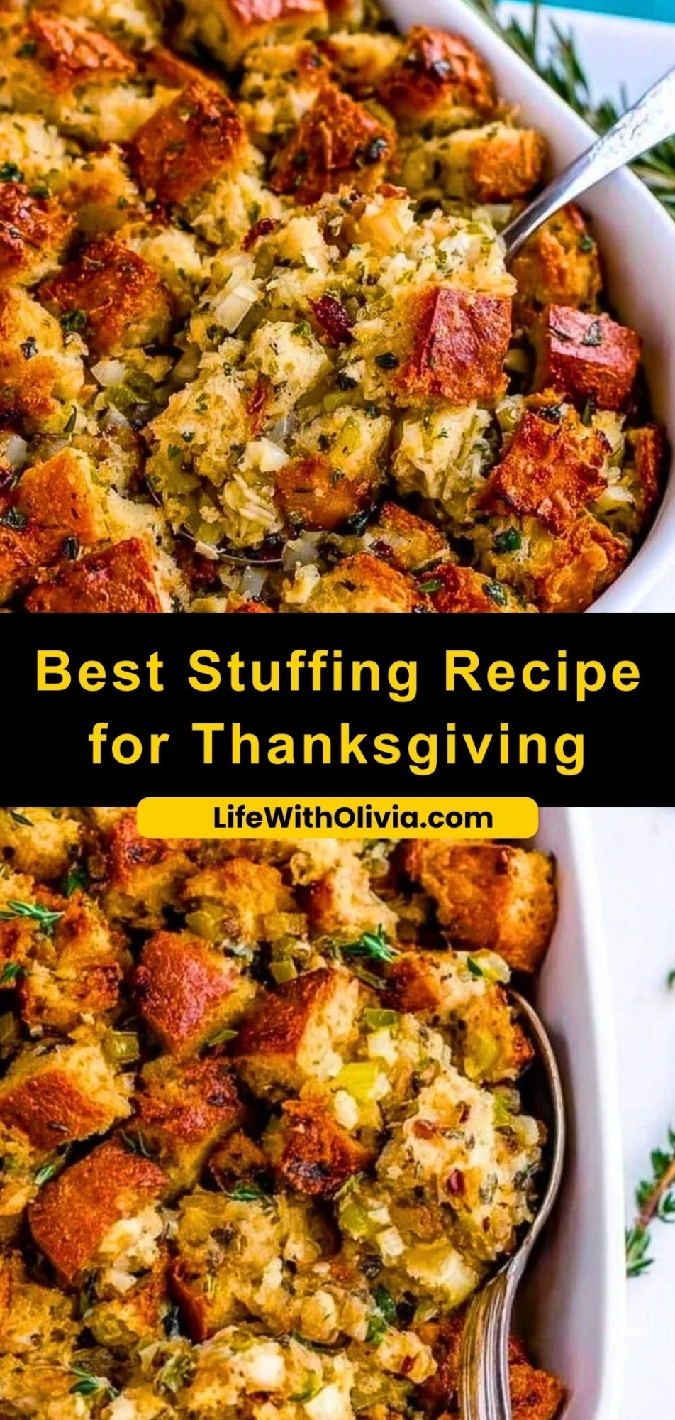 This Best Stuffing Recipe for Thanksgiving is golden and crispy on top, tender in the center, and full of savory, herb-infused flavor. With sautéed veggies, fresh and dried herbs, and buttery goodness soaked into every cube of bread, it’s the perfect side dish to complete your holiday table.