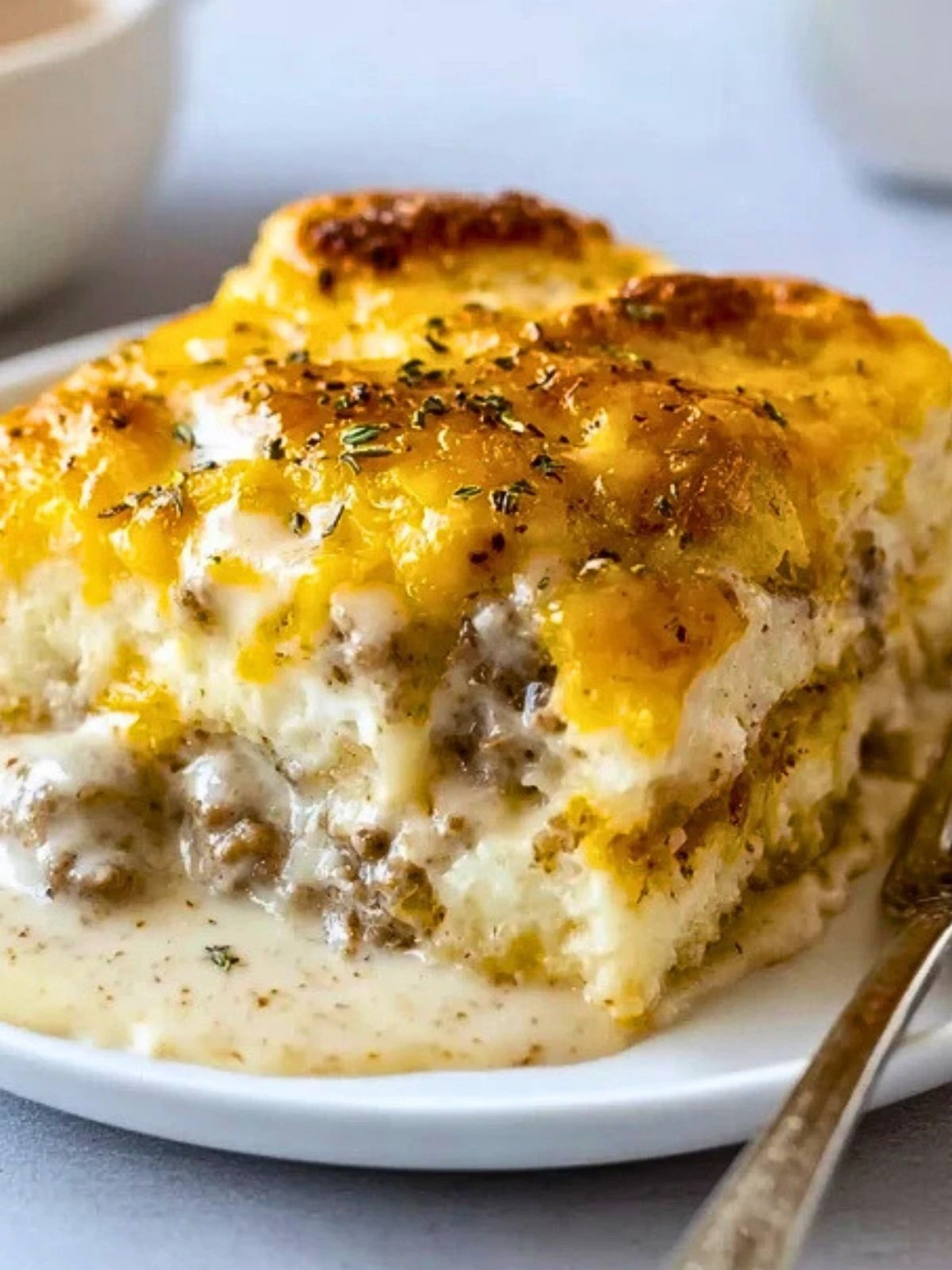 7. Pour sausage gravy over biscuit layer.