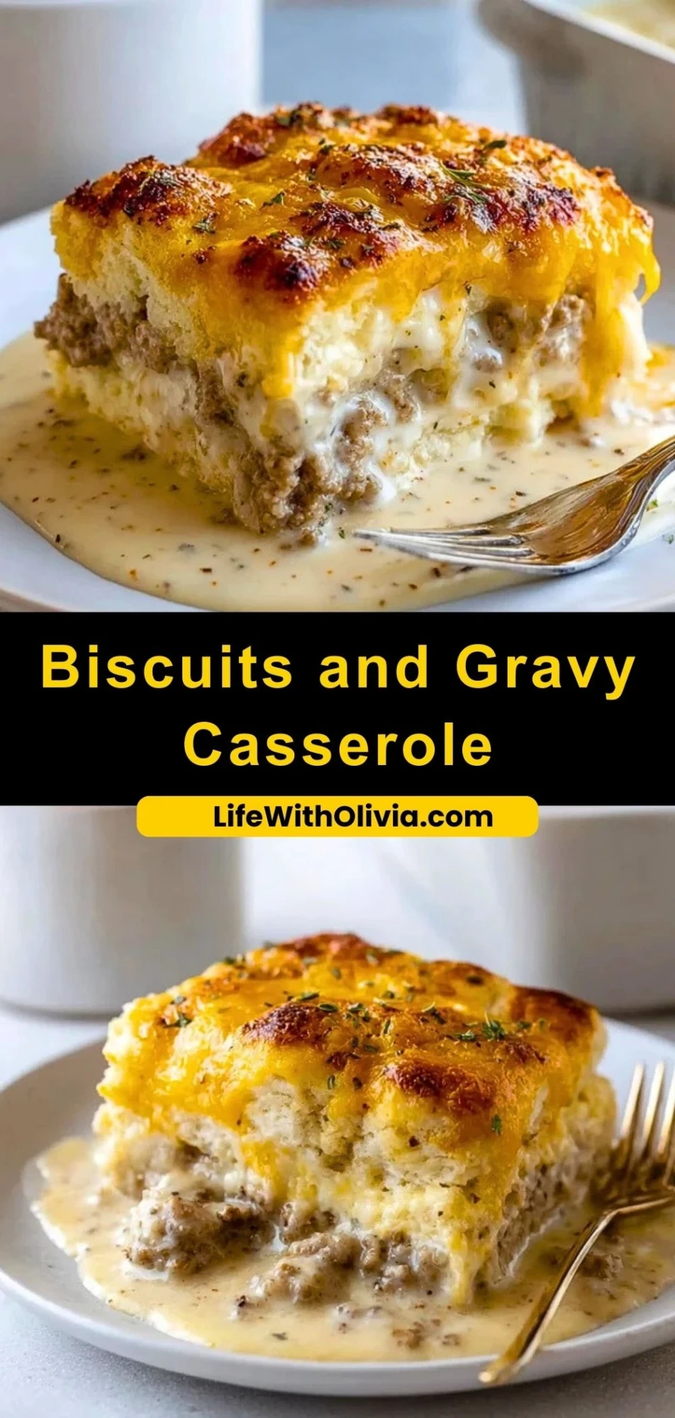 Keywords: biscuits and gravy casserole, breakfast casserole, sausage bake