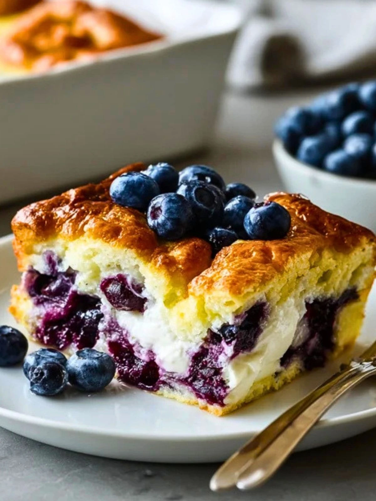 This bake is delicious served warm, at room temperature, or even chilled straight from the fridge. For breakfast, pair it with extra fresh berries, a spoonful of Greek yogurt, or a light dusting of powdered sugar. If you want to make it feel more like brunch, serve it with turkey sausage, scrambled eggs, or a fruit salad.