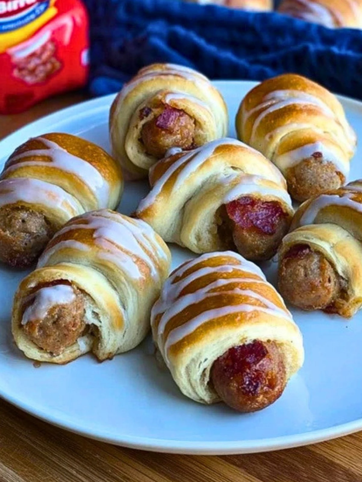 Mix powdered sugar with a splash of milk to create a glaze. Once the pigs in a blanket have cooled slightly, drizzle the glaze over each one.