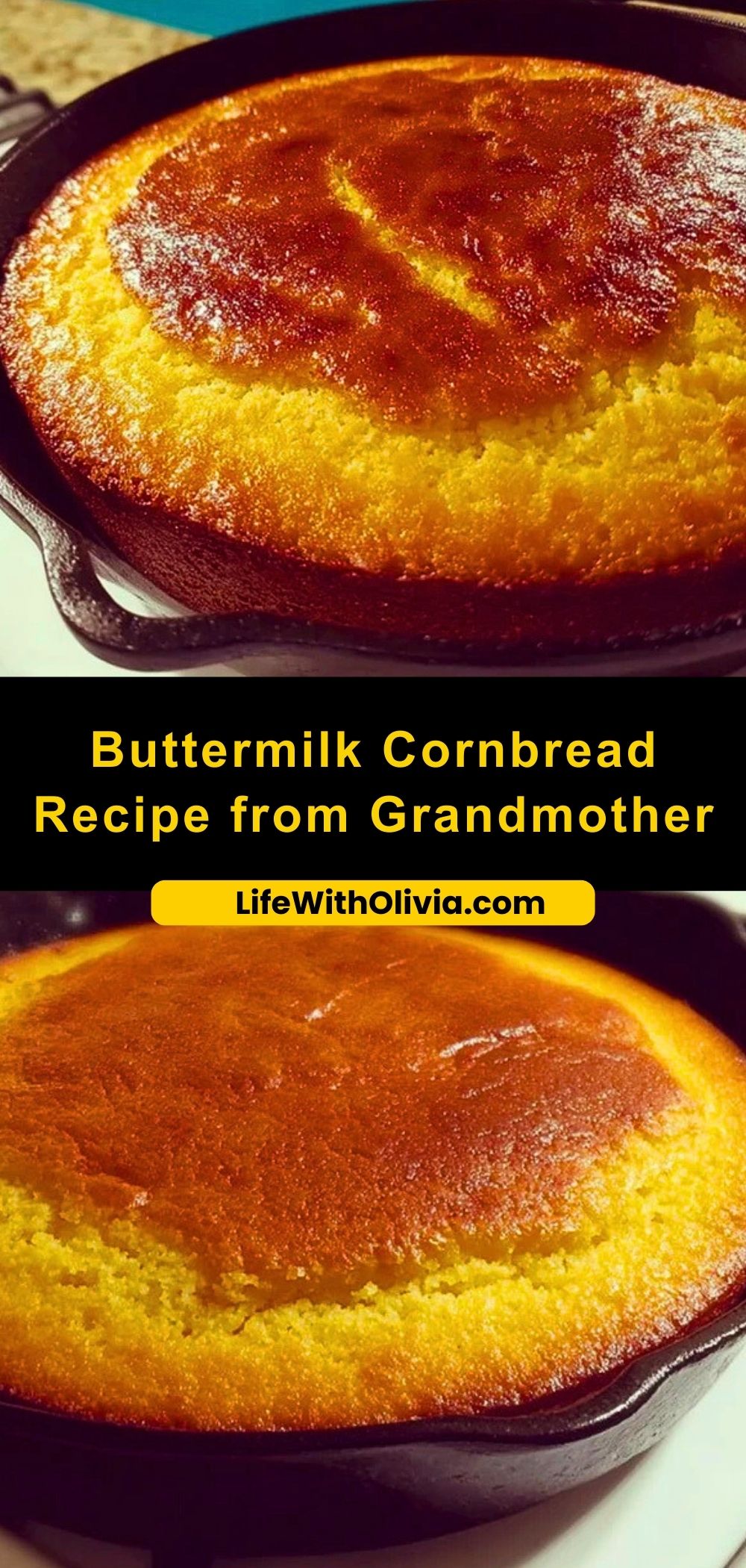 This golden, crispy-edged Buttermilk Cornbread is a family heirloom recipe passed down from Grandmother’s kitchen. It’s tender, buttery, and slightly tangy from real buttermilk—baked in a hot cast iron skillet for the perfect Southern side.