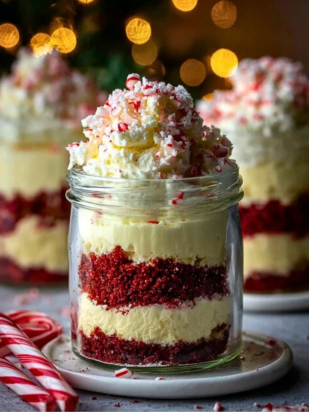 Festive, creamy, and bursting with peppermint joy, Candy Cane Cheesecake Parfaits are the ultimate holiday dessert in a jar. These layered beauties bring together fluffy cheesecake mousse, rich red velvet cake crumbs, and a snowy topping of whipped cream dusted with crushed candy canes. Whether you’re hosting a holiday party or just want to surprise your family with something merry and bright, this no-bake dessert checks all the boxes for presentation and flavor.