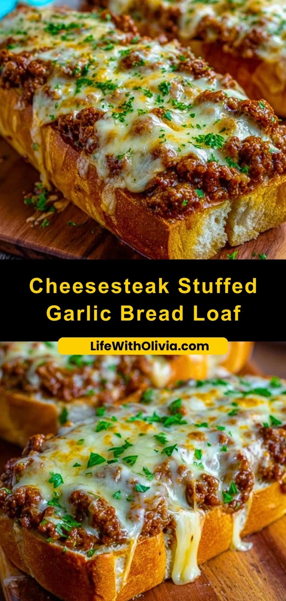 This cheesesteak stuffed garlic bread loaf is what dreams are made of. Imagine thick, crusty bread overflowing with seasoned ground beef, sautéed onions, and gooey melted cheese — all the classic flavors of a Philly cheesesteak baked into a golden garlic bread boat. It’s savory, cheesy, and completely satisfying with every bite.
