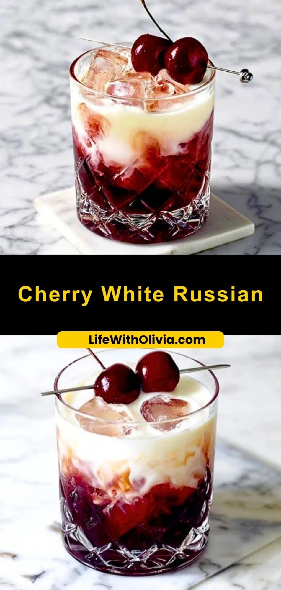 The Cherry White Russian is best served immediately after preparation while the layers are still beautifully distinct and the ice keeps everything chilled. Serve it in an old-fashioned glass with a cherry garnish to emphasize its dessert-like charm. It makes a perfect after-dinner drink or a signature cocktail for cozy nights in.