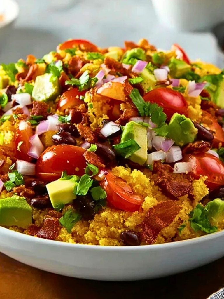 What makes this salad shine is the beautiful layering and the contrast of textures—crumbly cornbread paired with juicy tomatoes, creamy avocado, sharp onions, and crunchy bacon. Every forkful delivers a bold, zesty bite with just the right amount of freshness and richness.