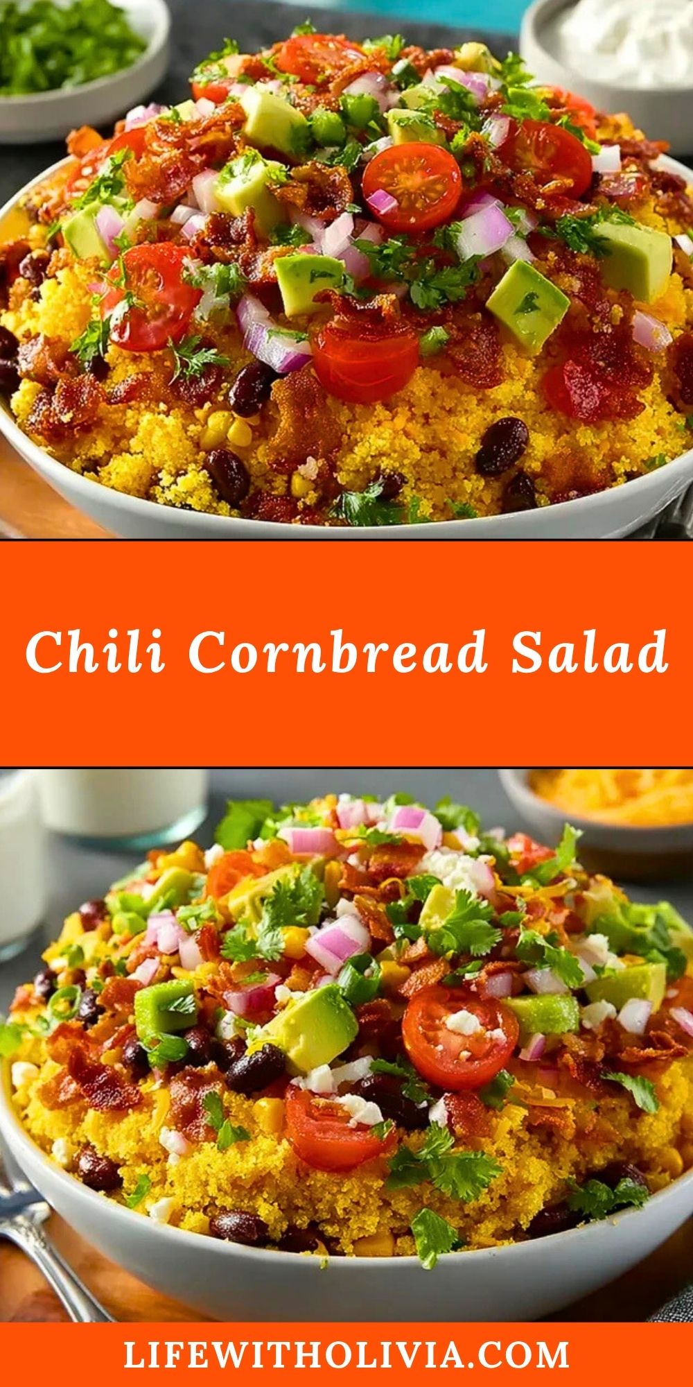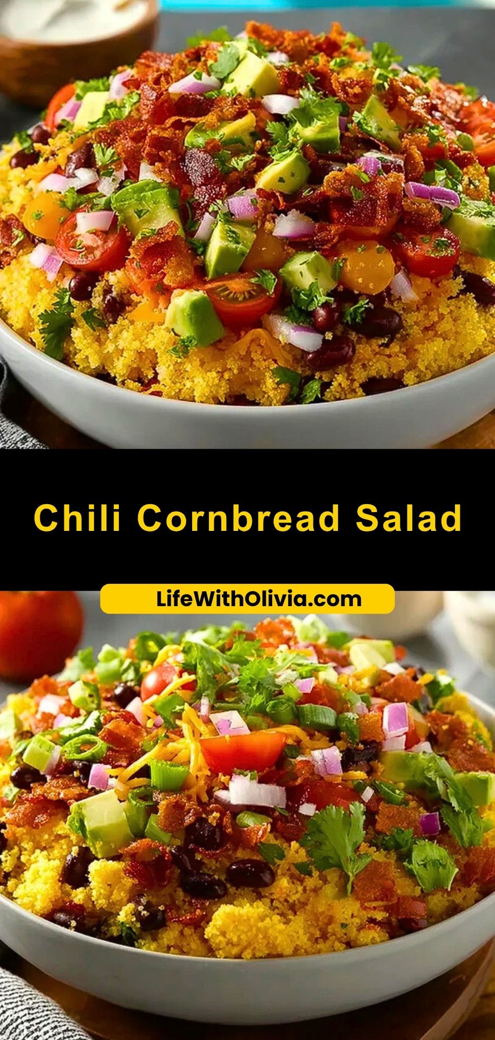 This Chili Cornbread Salad is a layered Southern-style dish packed with flavor and color. Crumbled sweet cornbread combines with smoky chili, black beans, crisp vegetables, creamy avocado, and a tangy ranch drizzle. It’s the perfect crowd-pleaser for potlucks, cookouts, or a hearty side to any Tex-Mex meal.