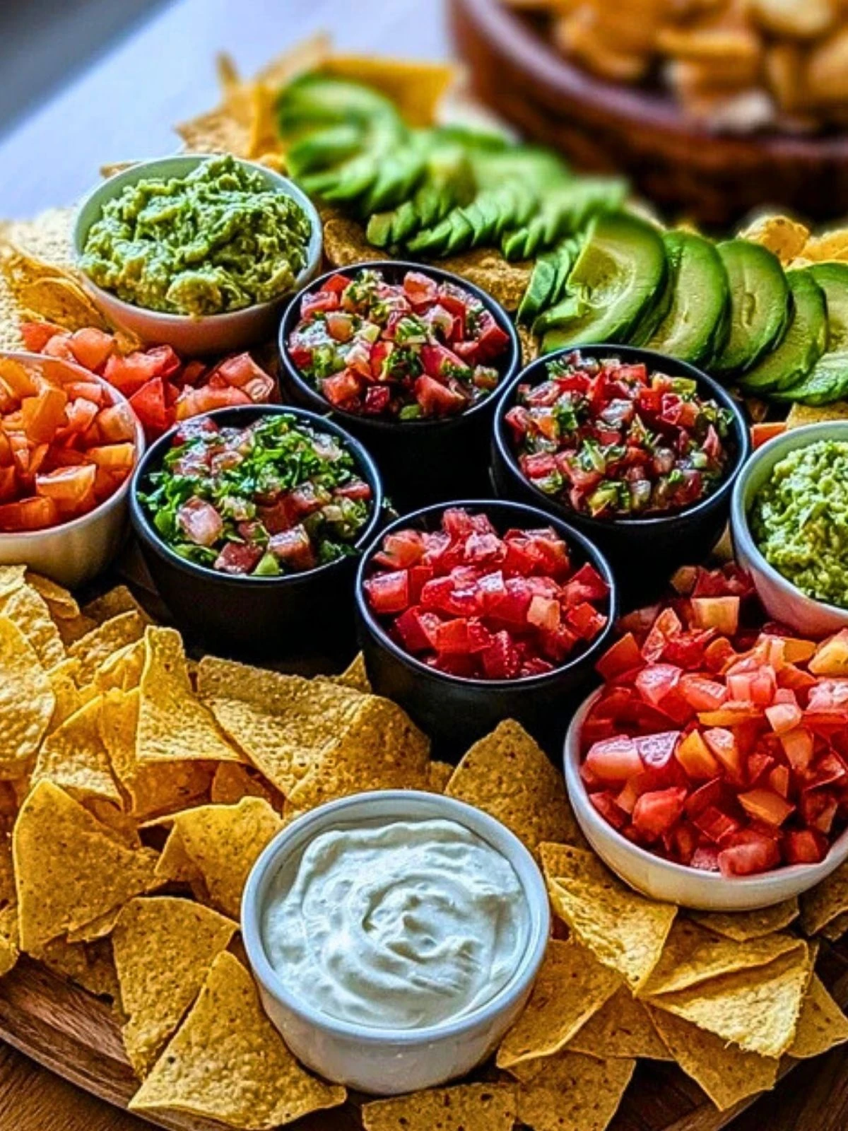 What makes this board irresistible is the variety it offers. Think creamy guacamole, zesty salsa fresca, tangy sour cream, and crunchy pico de gallo all lined up beside golden tortilla chips. Add vibrant chopped veggies or even fruit-based dips like mango salsa to mix things up. The visual appeal is just as satisfying as the flavor — and that’s what makes this spread so inviting on any table.
