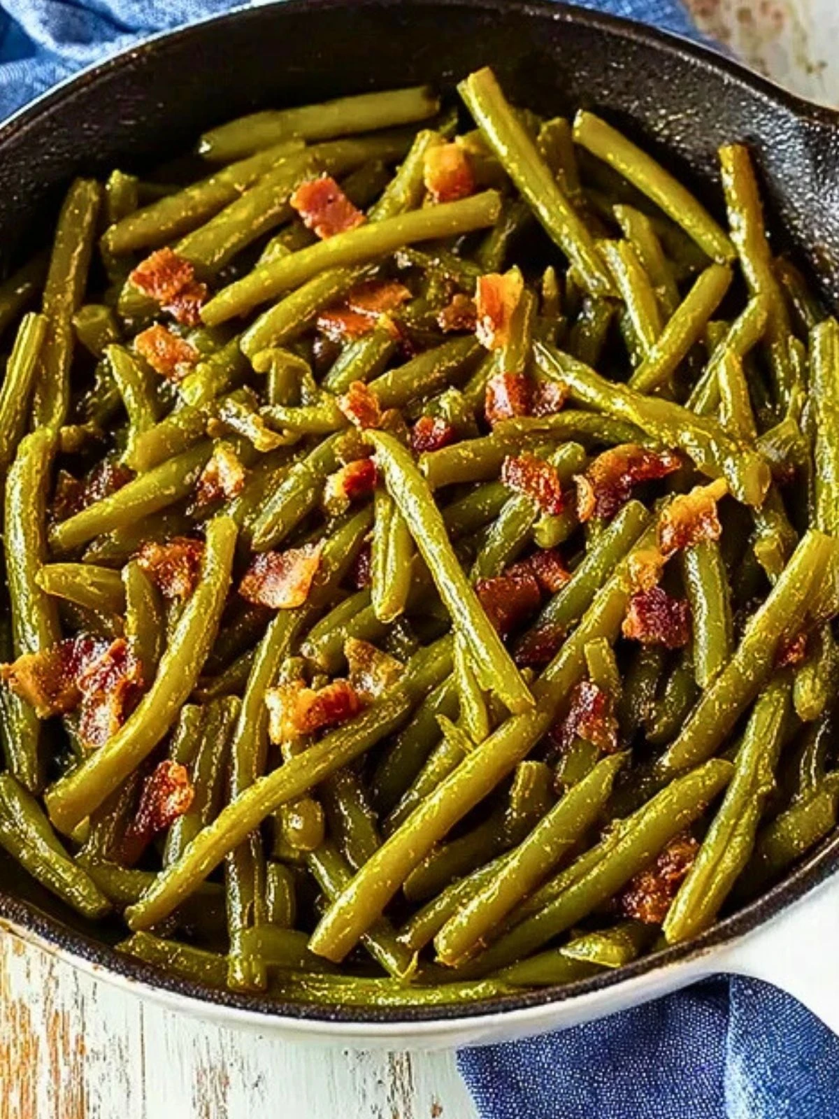 These green beans shine best as a warm side dish right out of the skillet. Serve them with hearty entrees like grilled steak, roasted turkey, baked pork chops, or even meatloaf. They also pair well with mashed potatoes or cornbread for a complete Southern-style spread.