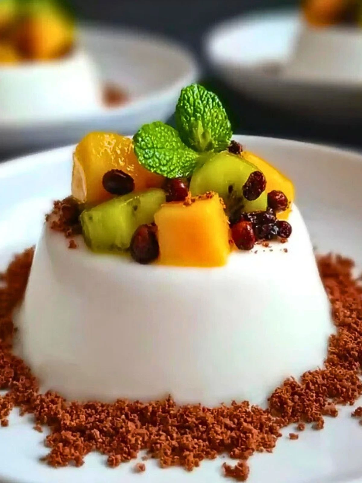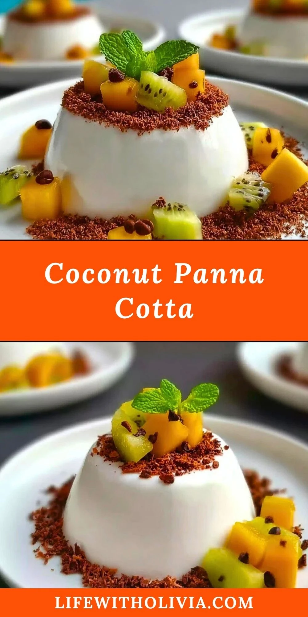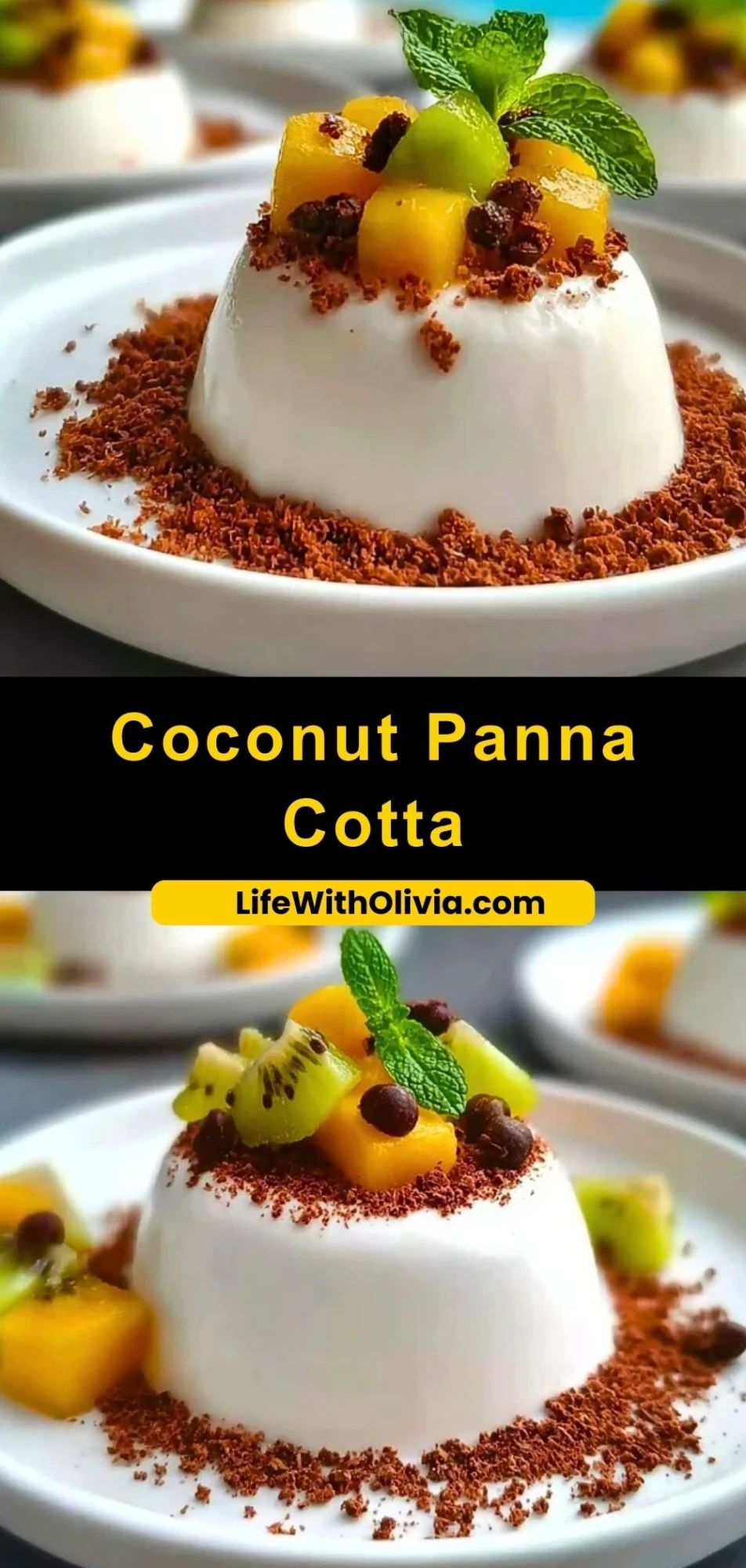 Coconut Panna Cotta is best served chilled and garnished just before serving. When unmolded onto a plate, its delicate wobble and smooth surface make it an eye-catching dessert. For a vibrant touch, spoon a medley of diced tropical fruits like mango, kiwi, and passionfruit on top, then sprinkle with crushed chocolate cookies or toasted coconut for a delightful crunch. A mint sprig adds a final flourish.