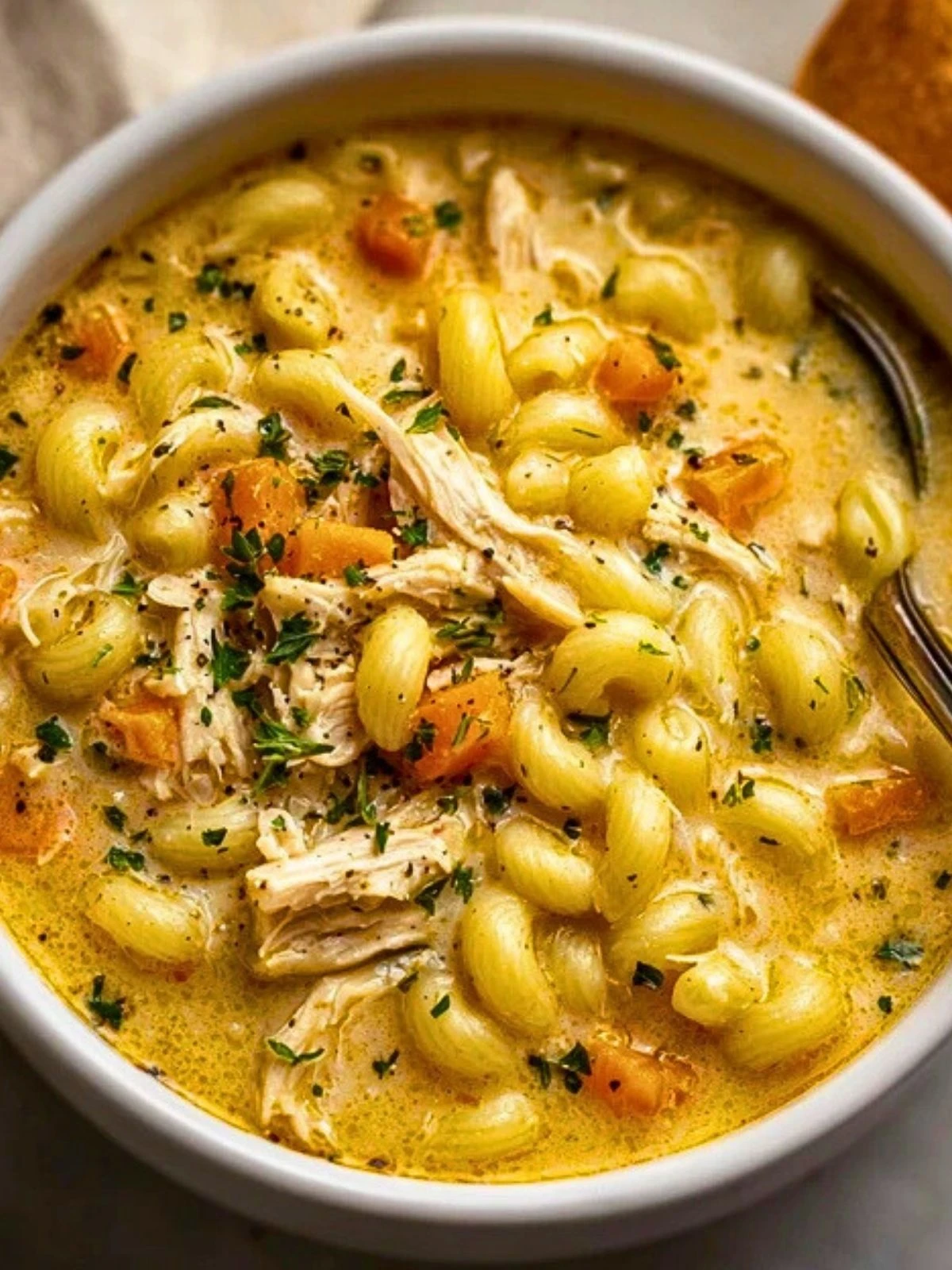 Keywords: creamy soup, chicken macaroni, comfort food, easy dinner, pasta soup