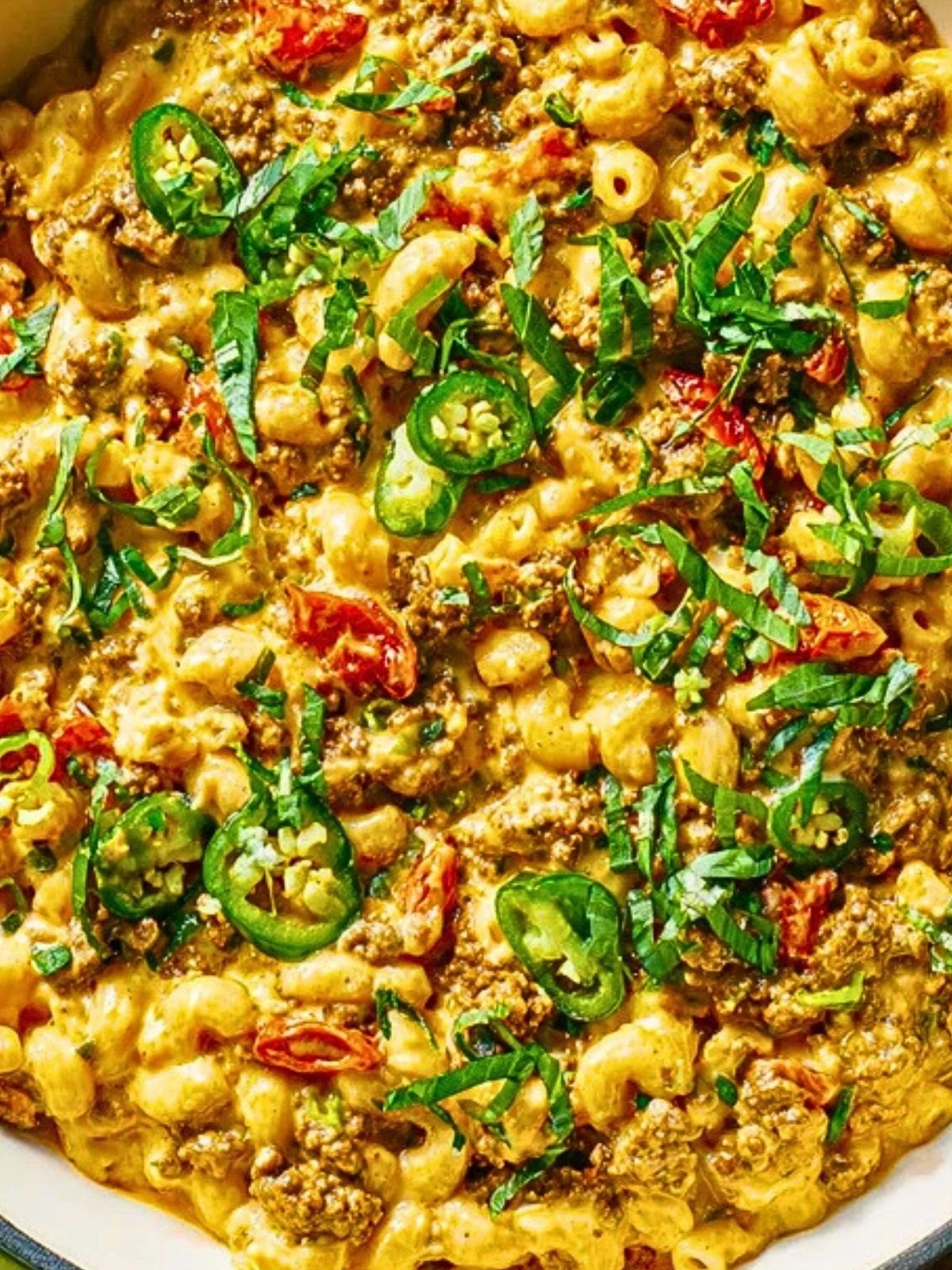 When classic comfort food meets bold Mexican flavor, you get this creamy taco mac and cheese. It’s a one-skillet wonder packed with seasoned ground beef, tender macaroni, and a luxuriously smooth cheese sauce. Toss in a few fiery jalapeños, sweet cherry tomatoes, and fresh herbs, and you’ve got a dish that brings the heat and the comfort.