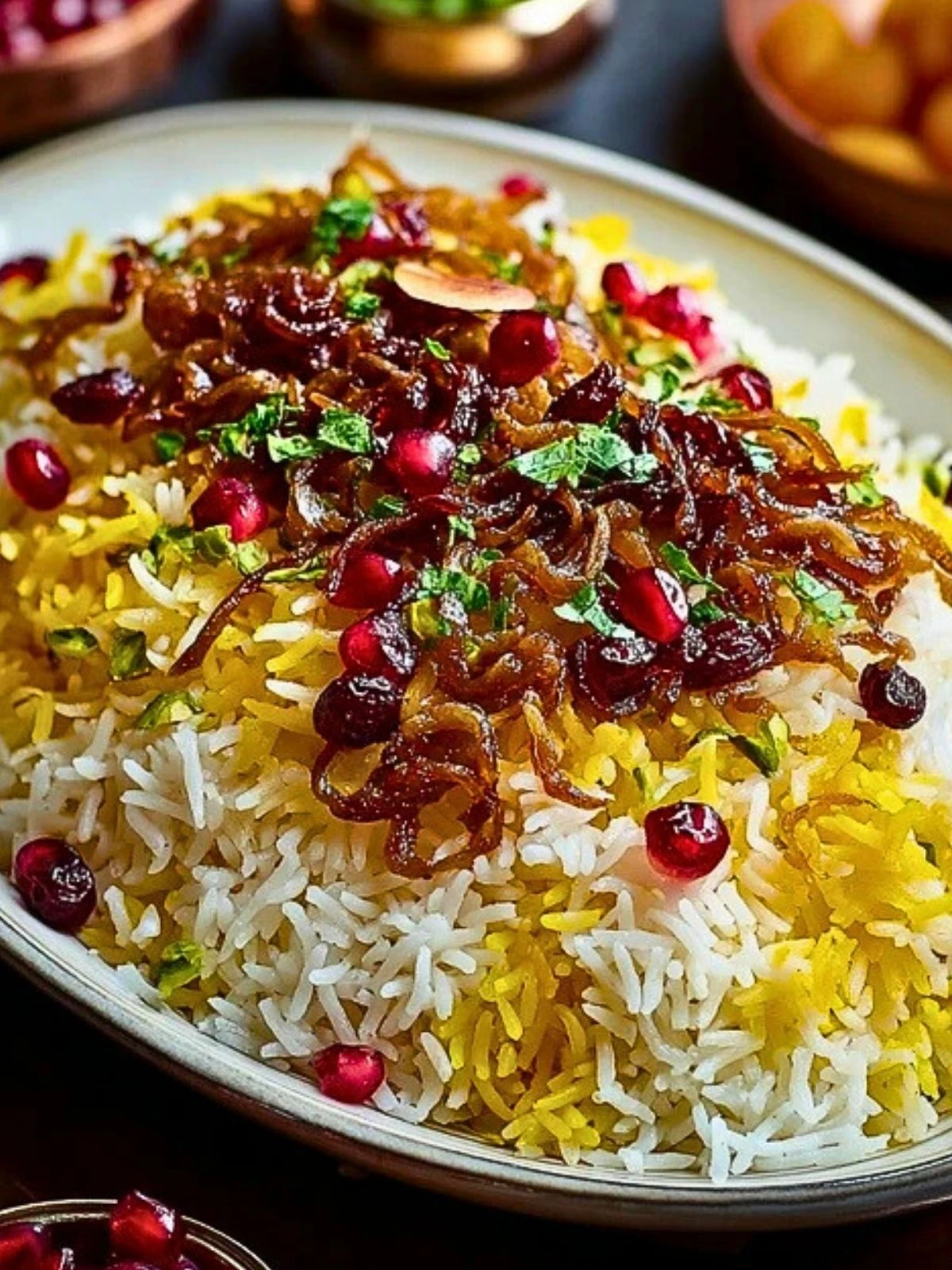 The rich golden saffron rice is layered with barberries, candied orange peel, slivered almonds, pistachios, and sweet fried onions, creating a stunning contrast of flavors and colors. A sprinkle of pomegranate arils adds a juicy crunch that makes every bite exciting. It’s not just food; it’s a culinary experience.