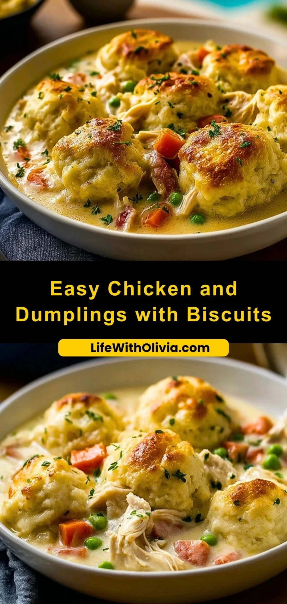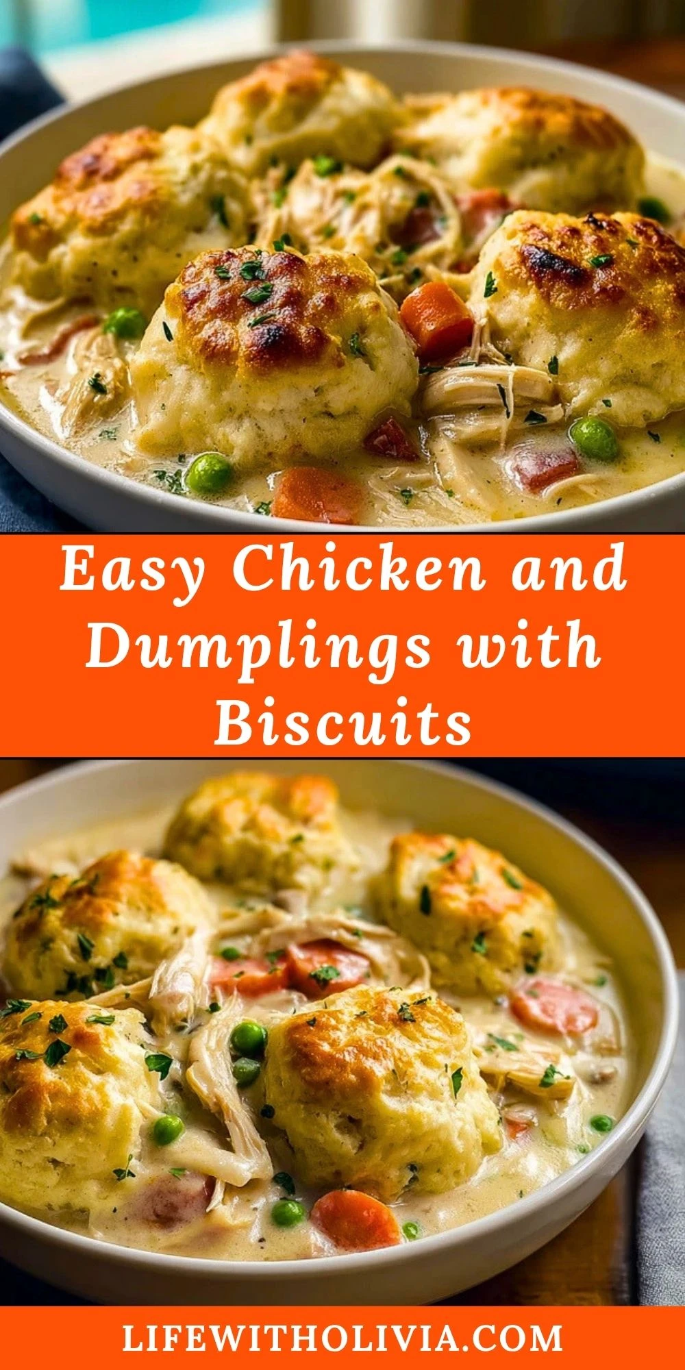 This Easy Chicken and Dumplings with Biscuits recipe is the ultimate comfort food that’s quick enough for weeknights but hearty enough to warm your soul. Featuring tender shredded chicken, a creamy seasoned broth, peas, carrots, and fluffy golden biscuits on top, it’s a must-try family dinner. Whether you’re looking for a cozy cold-weather meal or an easy recipe to use up leftover chicken, this dish fits the bill. Great for dinner ideas, easy recipe lovers, or those needing warm food ideas fast.