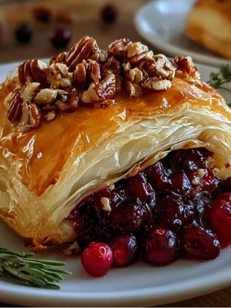 With just a few ingredients, the result is a warm, gooey center of melty brie cheese, sweet-tart cranberry sauce, and caramelized nuts—all baked into a crisp, flaky pastry shell. It’s the kind of treat guests gather around, slicing into layers of texture and flavor that feel both rustic and luxurious.