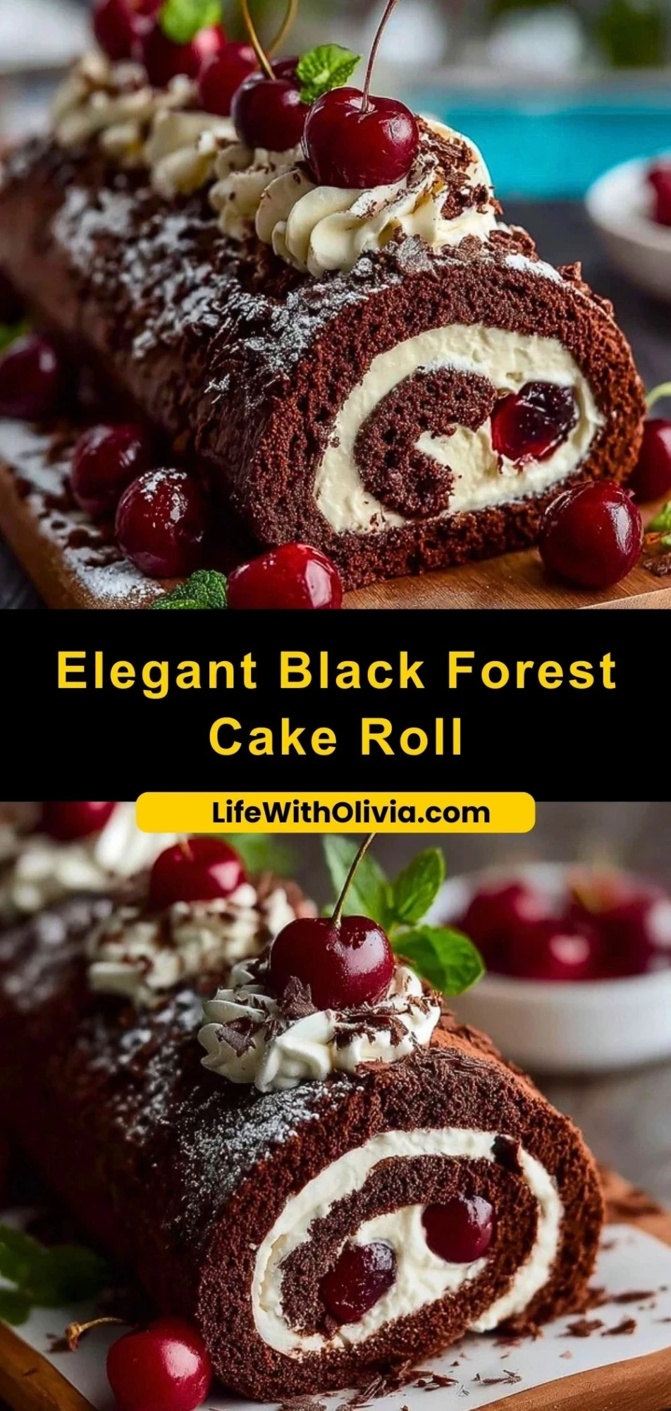 A showstopper dessert that delivers both visual drama and indulgent flavor, the Elegant Black Forest Cake Roll is a refined take on the classic German treat. This roulade features a deeply moist chocolate sponge, rolled around layers of whipped cream and cherries, then crowned with silky ganache, fresh cream swirls, and glistening whole cherries. Every bite offers a perfect harmony of rich cocoa, airy cream, and the tart-sweet burst of cherries.