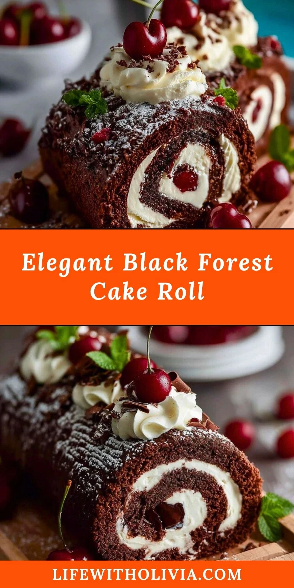 An Elegant Black Forest Cake Roll that combines a light chocolate sponge, velvety whipped cream, and rich cherry filling—finished with chocolate shavings and fresh cherries. A sophisticated dessert perfect for holidays, birthdays, or whenever you want to wow your guests.