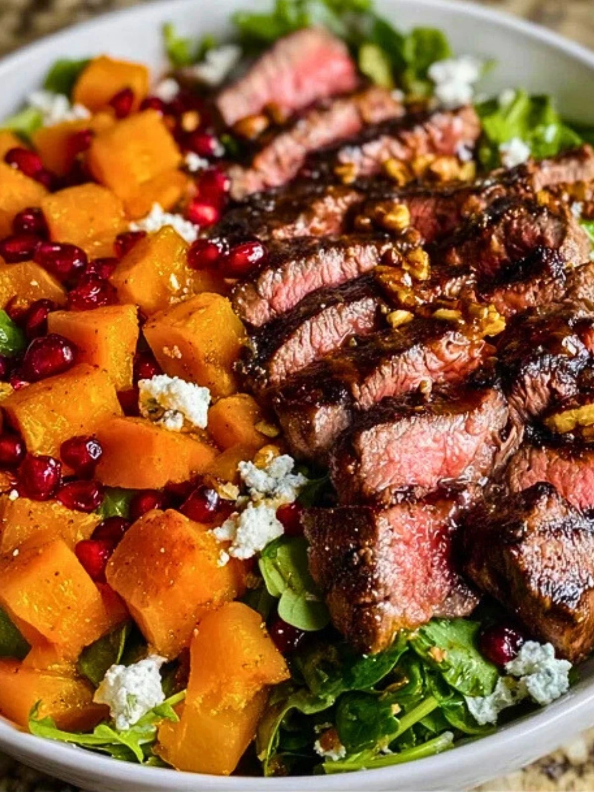 This hearty and vibrant Fall Harvest Steak Salad features juicy seared steak over crisp greens, with caramelized butternut squash, blue cheese crumbles, pomegranate seeds, and toasted walnuts. Drizzled with a tangy-sweet balsamic vinaigrette, it’s the perfect way to enjoy autumn flavors in a single, satisfying meal.