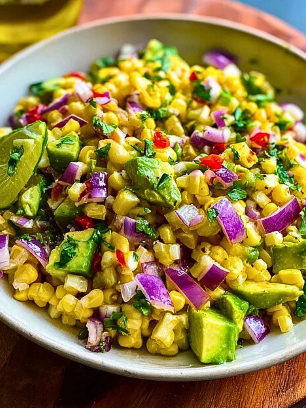 This vibrant and refreshing Fiesta Corn and Avocado Salad brings together sweet corn, creamy avocado, zesty lime, and crunchy red onion for a bold, colorful dish that’s perfect for potlucks, BBQs, or weeknight meals. It’s gluten-free, vegan, and easily adjustable for spice. Serve it as a side, a dip, or add protein for a full meal.