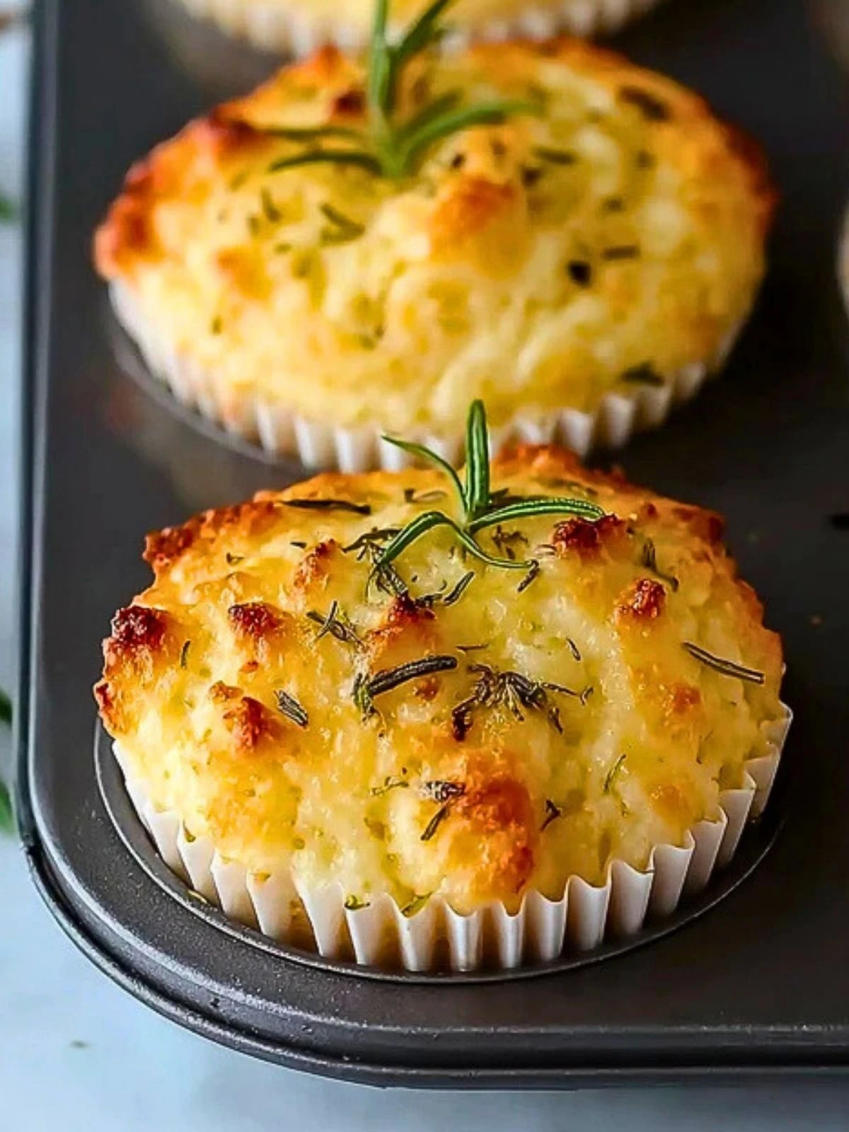 Scoop the batter evenly into the muffin cups. Top each with a few rosemary leaves and a light sprinkle of cheese if desired.
