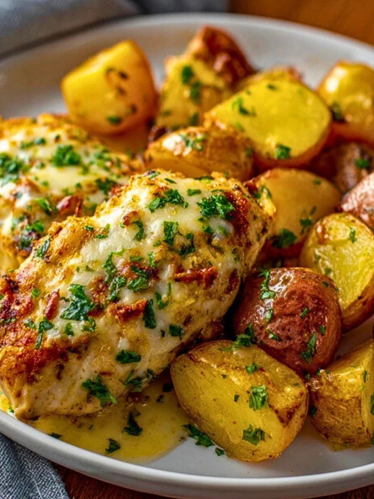 Cover loosely with foil and bake for 25 minutes. Remove foil, then bake an additional 15-20 minutes uncovered, until chicken is cooked through (165°F) and potatoes are fork-tender and golden.