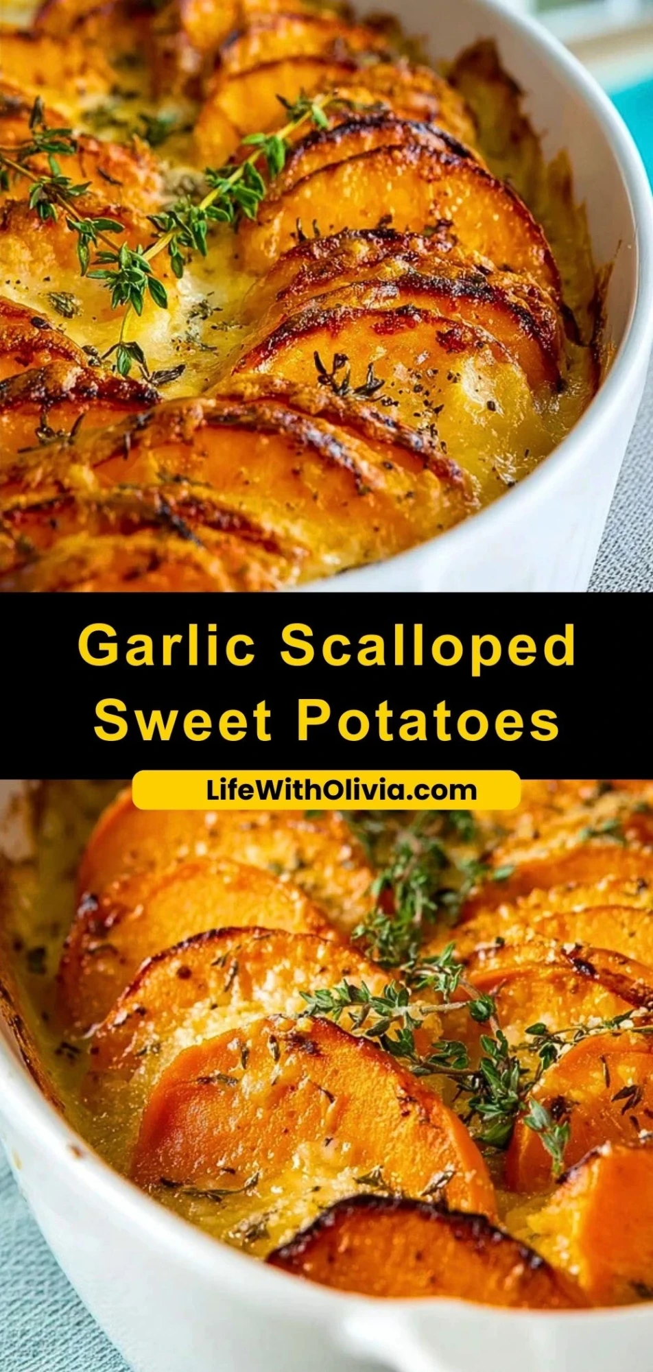 Keywords: garlic scalloped sweet potatoes, holiday side dish, creamy sweet potatoes