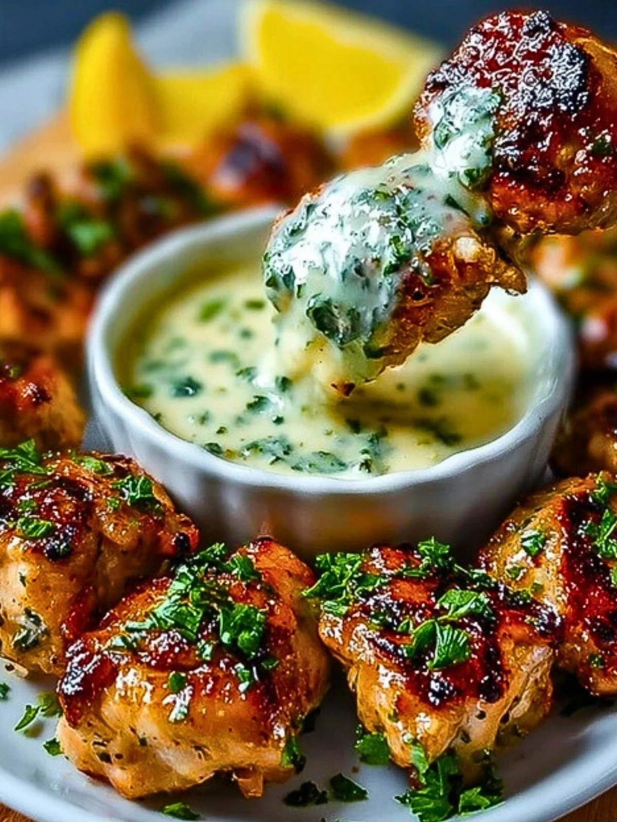 Golden, juicy, and dripping in flavor — these grilled chicken bites are a savory dream come true. Each tender piece is perfectly charred on the outside while staying moist on the inside, and the real star of the show is the luscious creamy garlic sauce that takes every bite to the next level. Whether you’re preparing a crowd-pleasing appetizer or a hearty main, this dish brings bold flavor and irresistible texture.