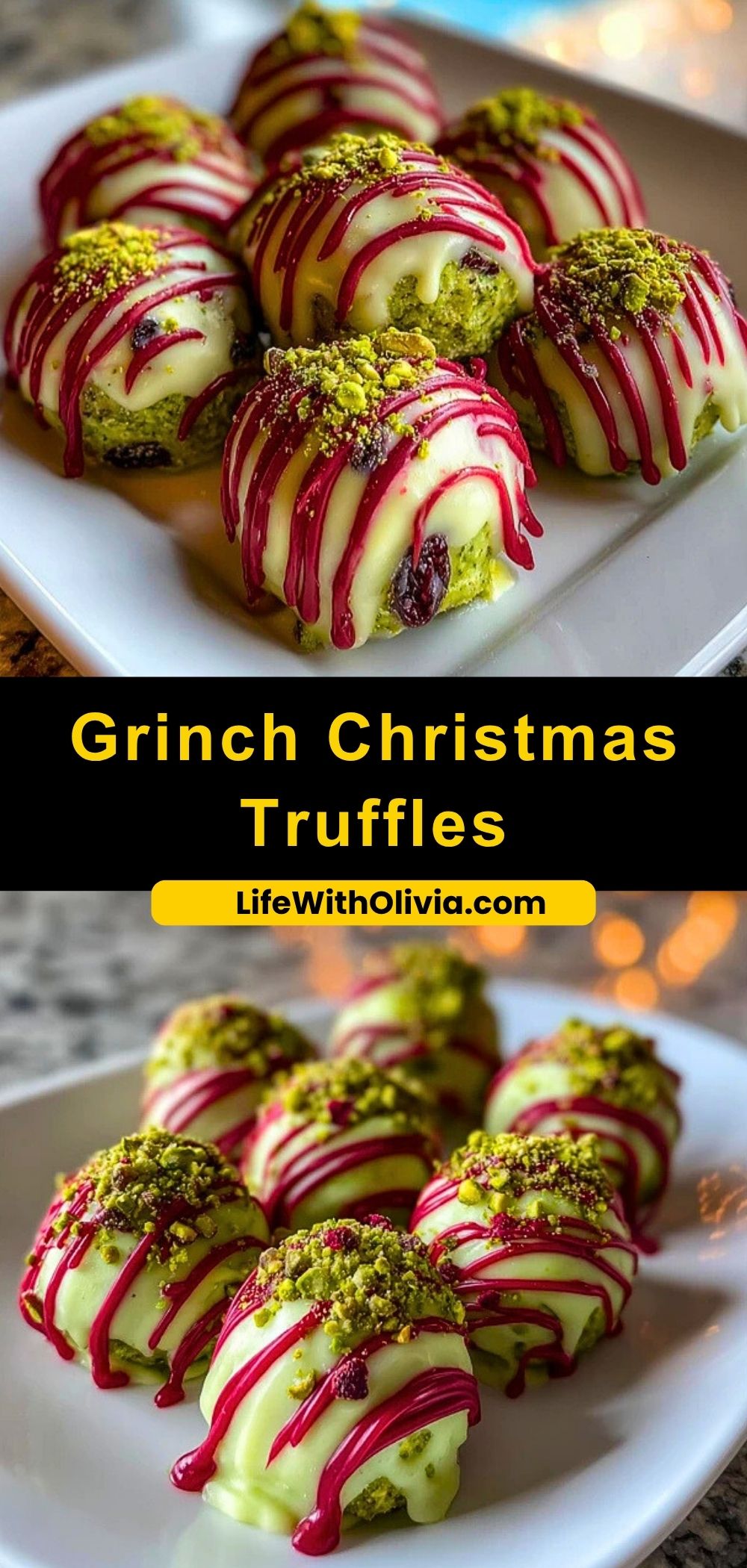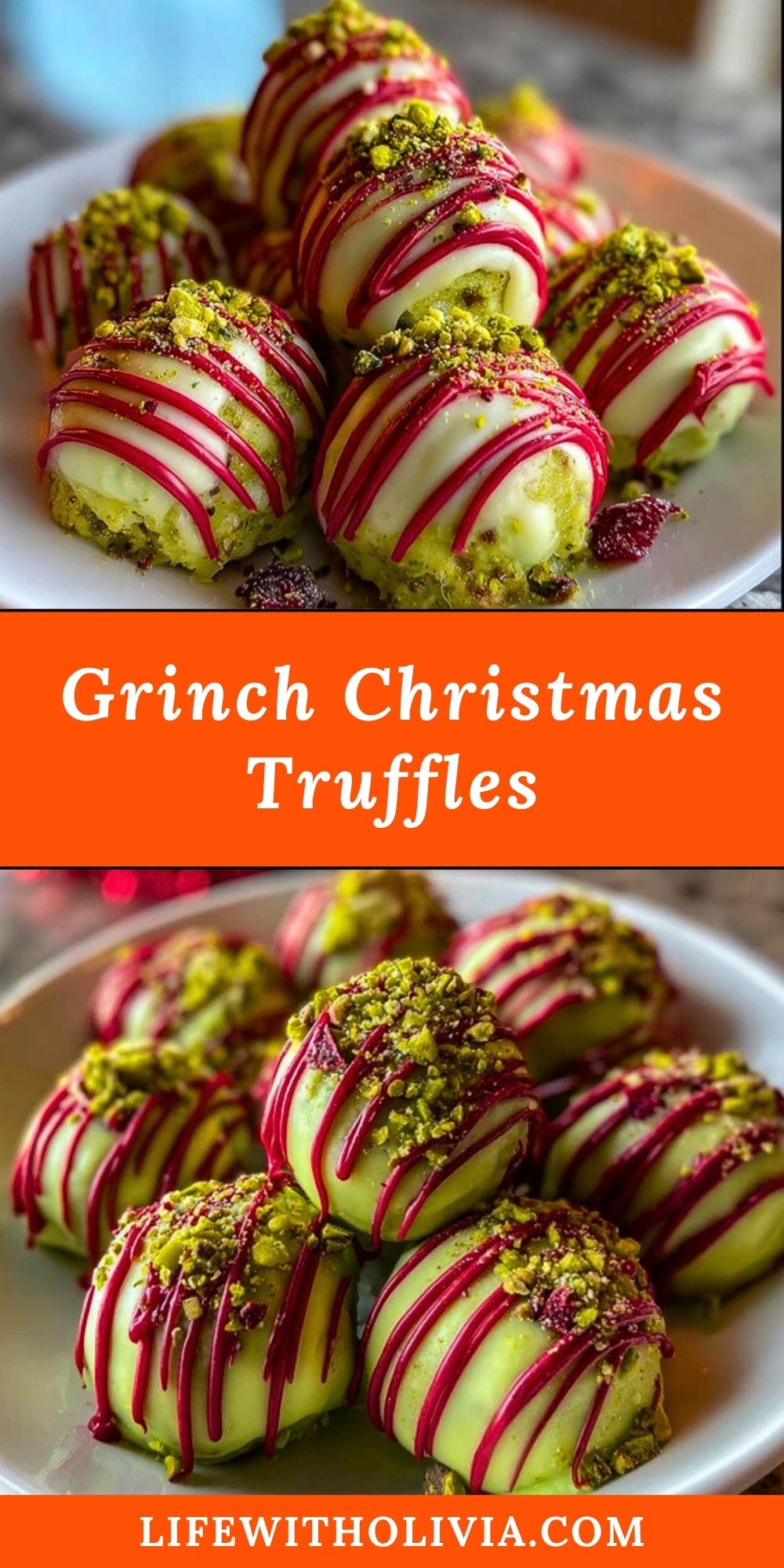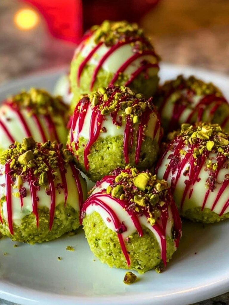 These festive Grinch Christmas Truffles are no-bake holiday treats made with pistachios, coconut, and sweetened condensed milk, then coated in white chocolate and finished with a red drizzle. Bright, fun, and perfect for gifting or holiday dessert trays!