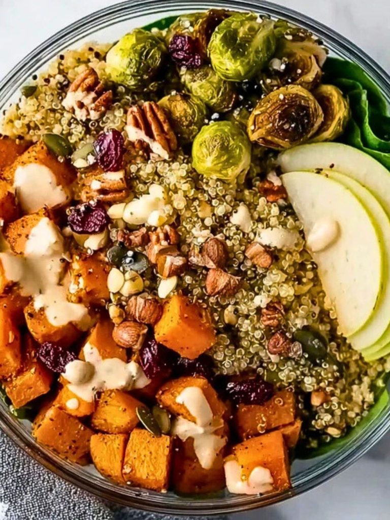 When it comes to fall-inspired comfort food that nourishes as much as it satisfies, this Harvest Quinoa Bowl with Creamy Tahini Dressing is a top contender. Packed with color, texture, and whole-food goodness, it’s a vibrant celebration of the season’s bounty. Imagine golden roasted butternut squash, crispy Brussels sprouts, nutty quinoa, crunchy pecans, and tart dried cranberries all layered into a bowl of warm, wholesome comfort.