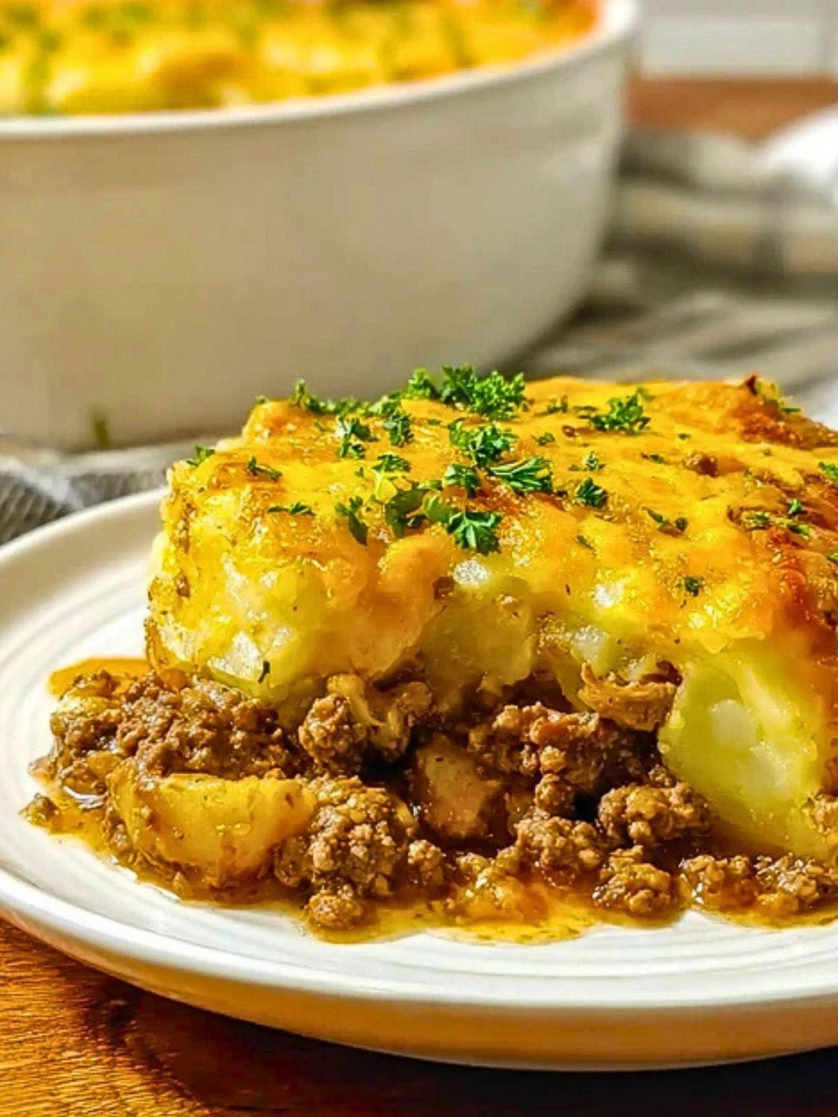 This casserole is best served fresh out of the oven, when the cheese is golden and bubbling and the layers are warm and savory. Pair it with a crisp green salad or roasted vegetables for a complete, satisfying meal. A dollop of sour cream on top adds a creamy tang that pairs beautifully with the rich beef and buttery potatoes.