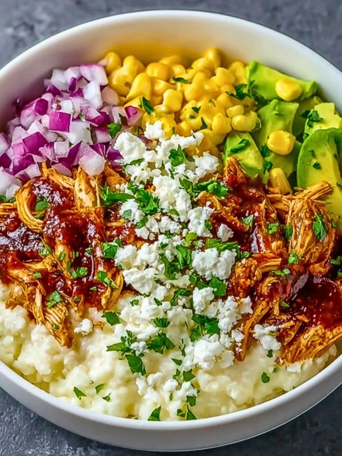 Keywords: high protein meal, easy dinner, healthy bowl, BBQ chicken bowl, meal prep ideas