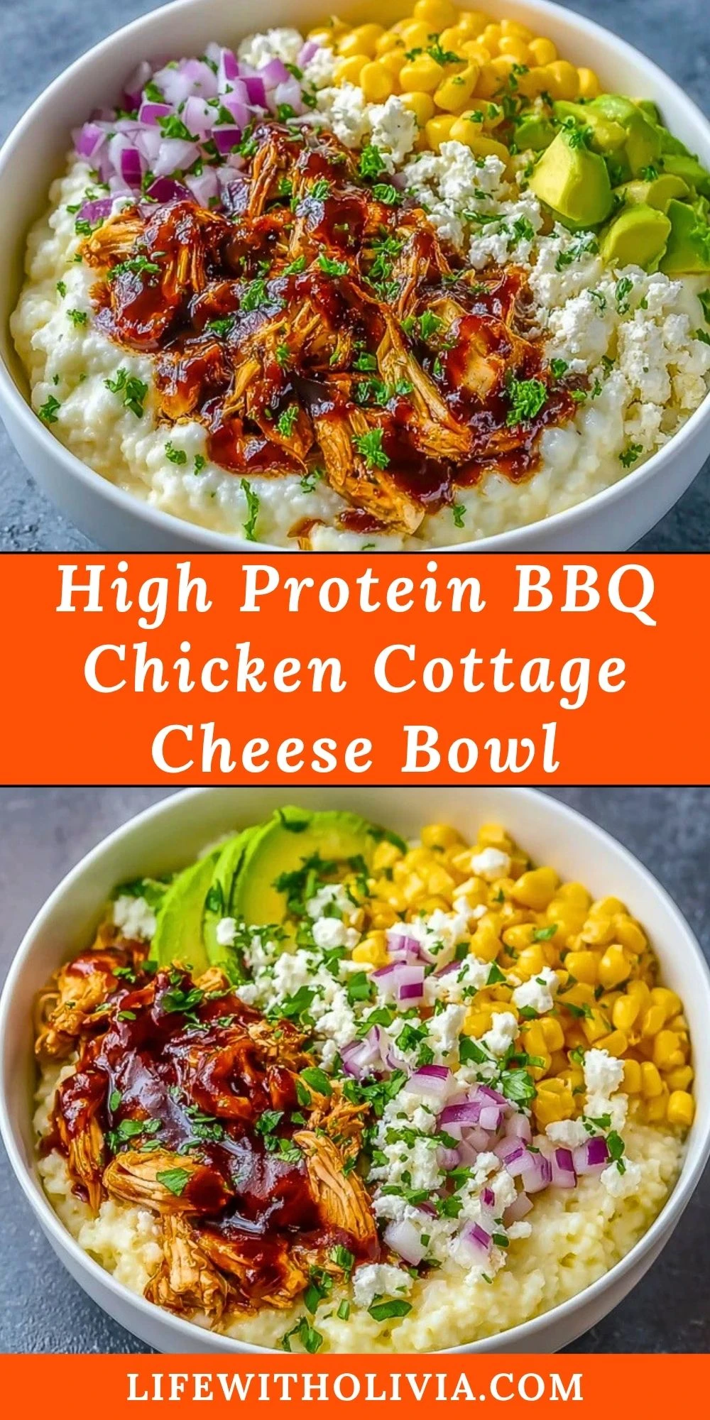 This high protein BBQ chicken cottage cheese bowl is a quick dinner, easy lunch, and healthy meal prep idea packed with flavor and nutrition. Juicy BBQ shredded chicken sits on a creamy cottage cheese base, topped with fresh avocado, corn, and tangy feta for a balanced, satisfying dish. Perfect for those looking for easy recipes, high protein meals, and delicious food ideas that come together fast.