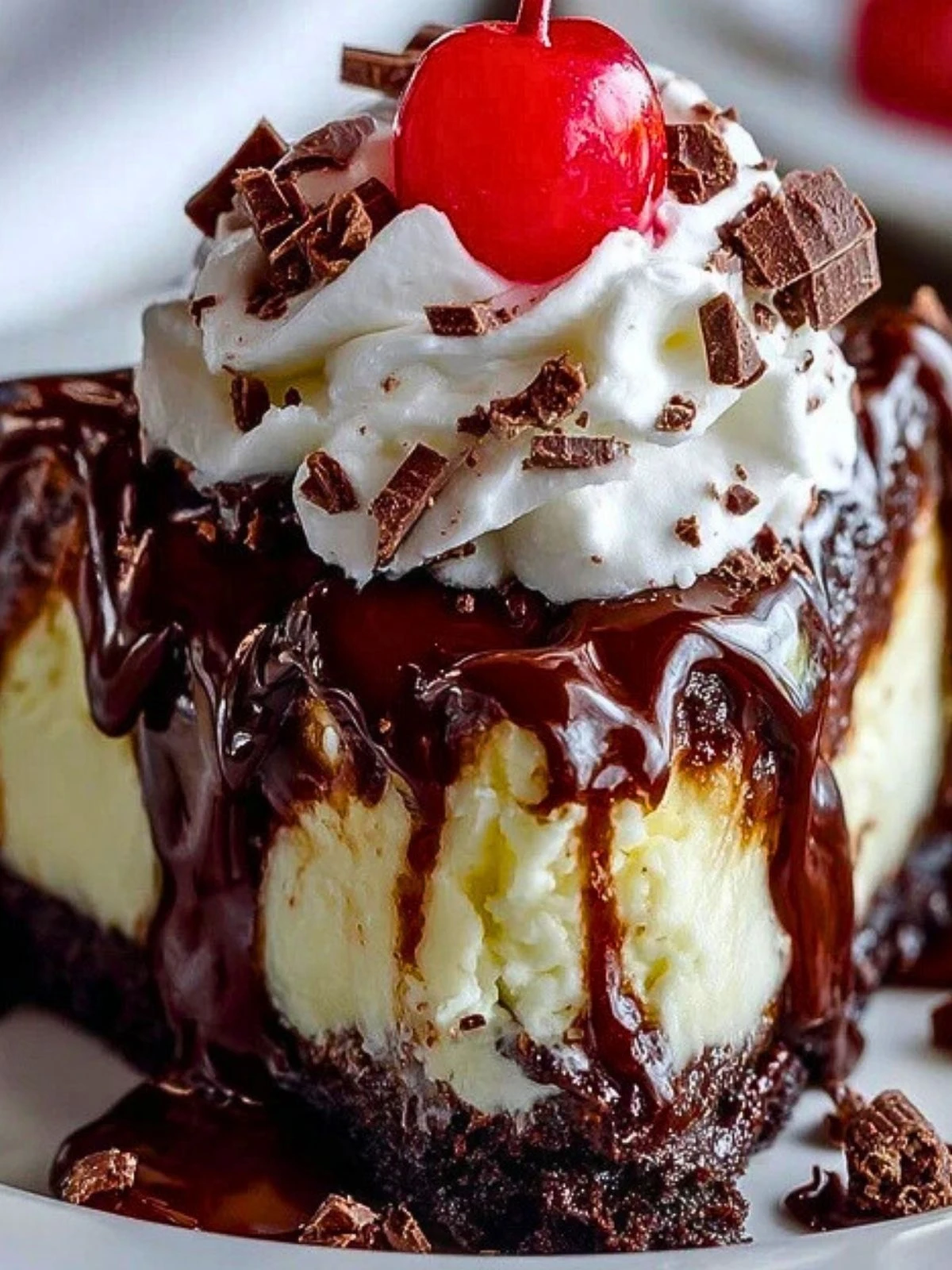 A rich and indulgent dessert with a chewy brownie base, creamy vanilla cheesecake center, and a decadent hot fudge topping. Topped like a sundae with whipped cream and a cherry, it’s a show-stopping treat perfect for celebrations or just satisfying your most intense chocolate cravings.