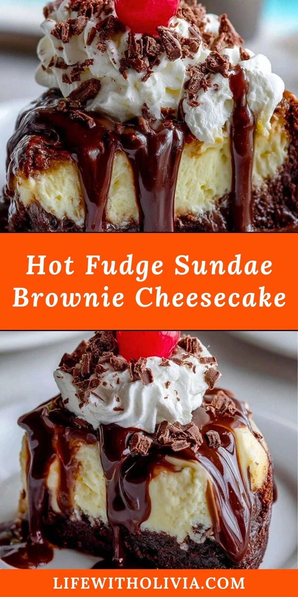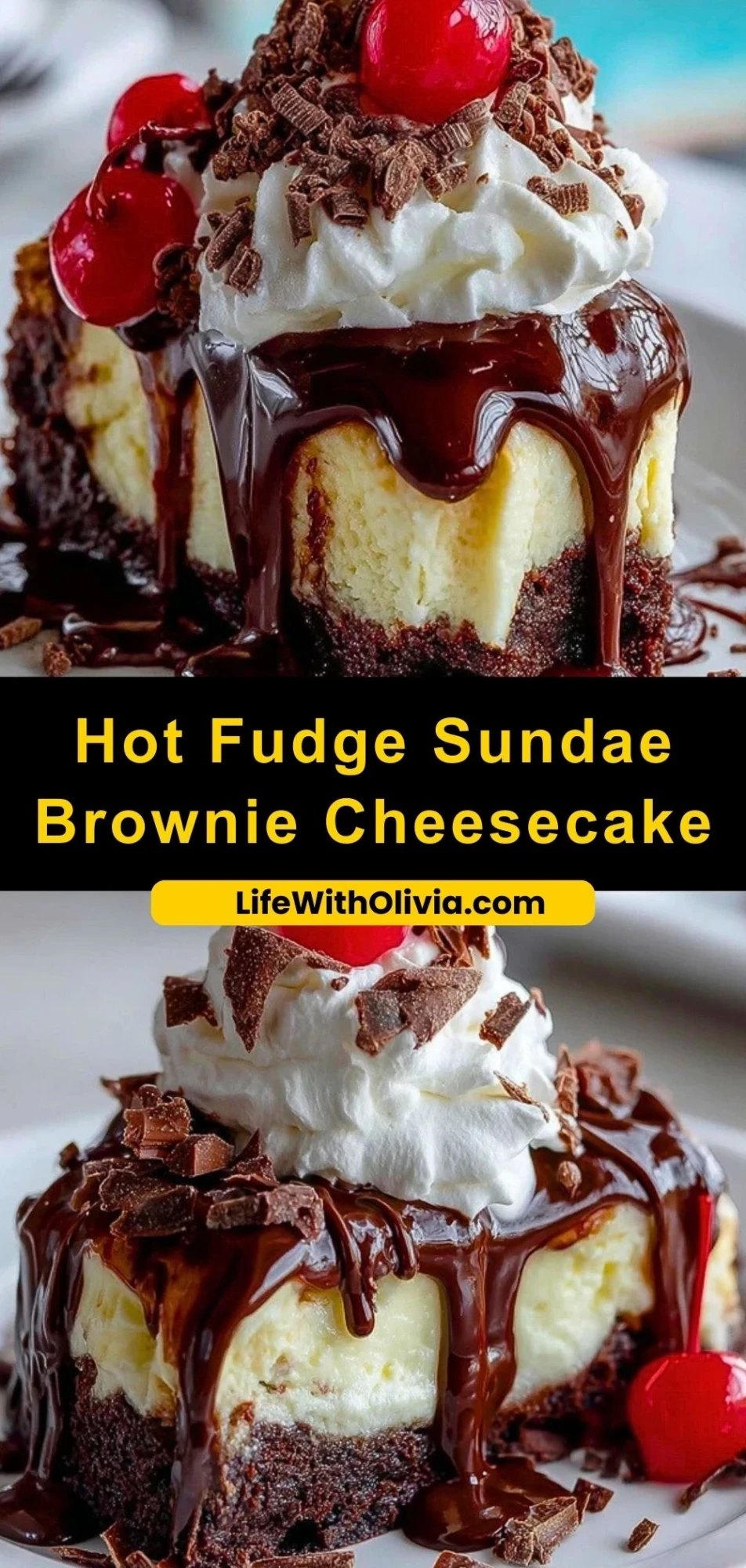 Keywords: cheesecake, brownie, hot fudge, sundae, layered dessert