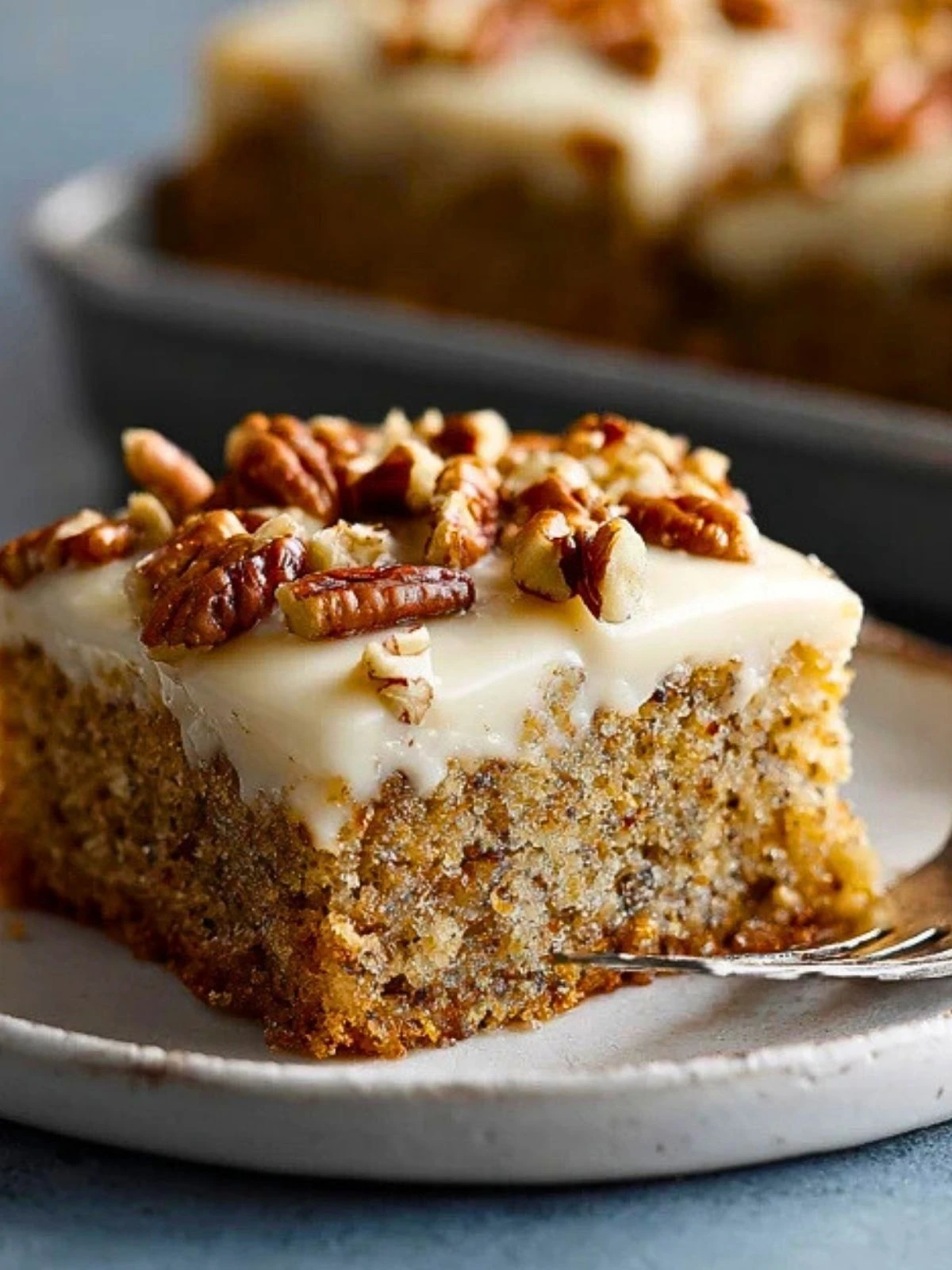 Let the cake cool completely in the pan on a wire rack. Once cool, frost with cream cheese frosting and sprinkle extra pecans on top for that final touch.