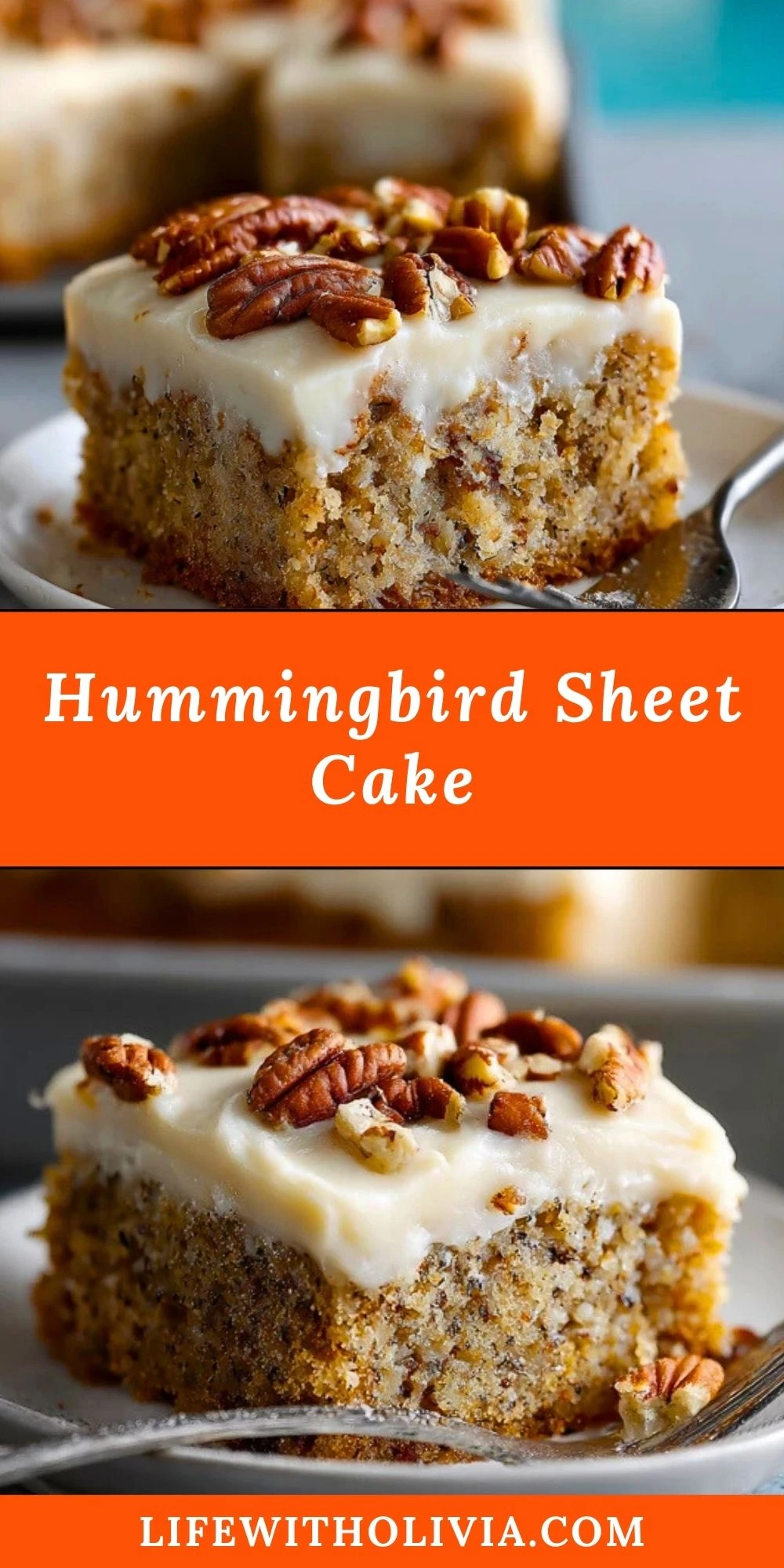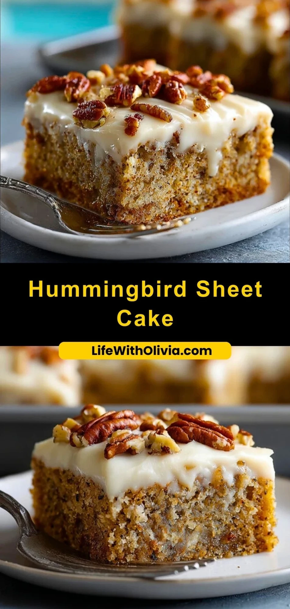 Serve the Hummingbird Sheet Cake chilled or at room temperature, depending on your preference. The cream cheese frosting firms up slightly when cold, offering a rich contrast to the soft cake. For an extra indulgent treat, top each slice with a dollop of whipped cream or a scoop of vanilla ice cream.