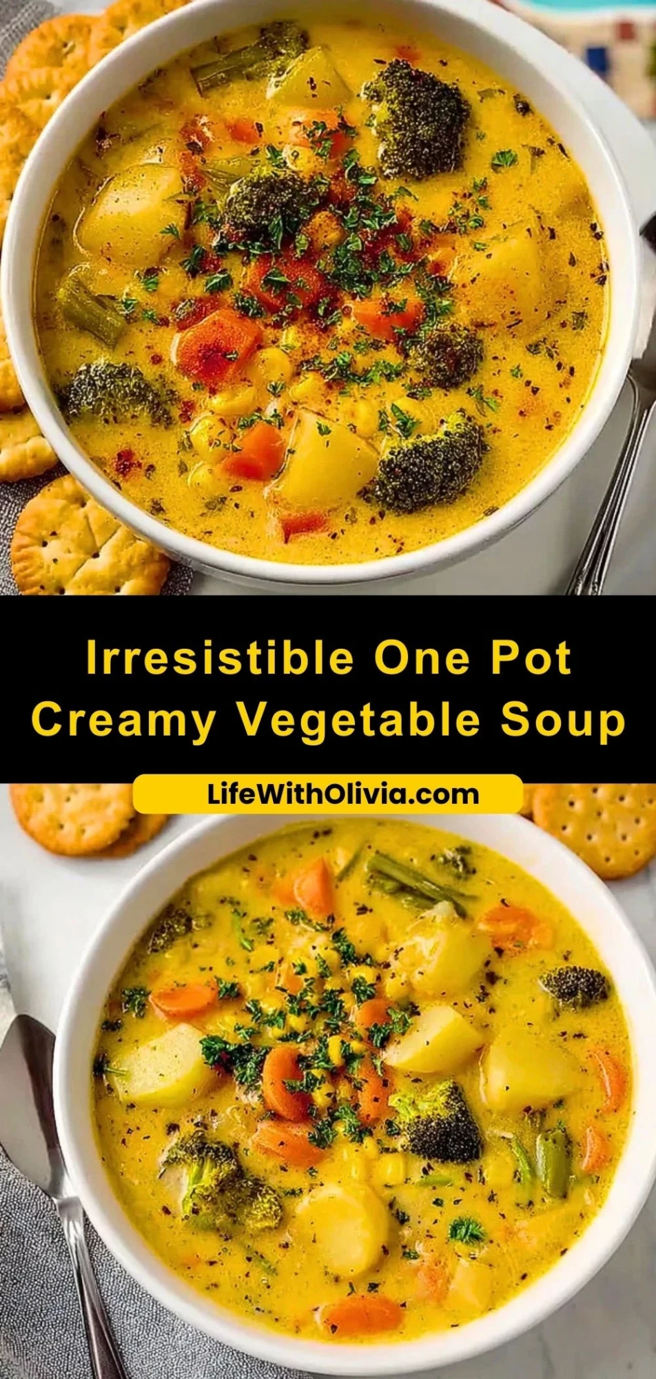This Irresistible One Pot Creamy Vegetable Soup is a warm, velvety blend of hearty vegetables simmered in a flavorful broth and finished with a creamy touch. Perfect for chilly nights or cozy lunches, this soup is easy to prepare and even easier to love. One pot, minimal cleanup, and loads of comforting flavor.