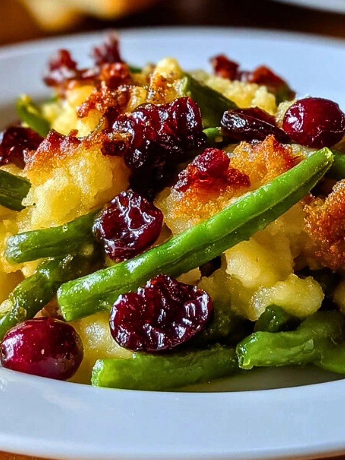 A vibrant and festive Thanksgiving side dish that combines creamy mashed Yukon Gold potatoes, crisp green beans, and tart cranberries—topped with a buttery golden crust. This dish is sure to be the centerpiece of your holiday spread.