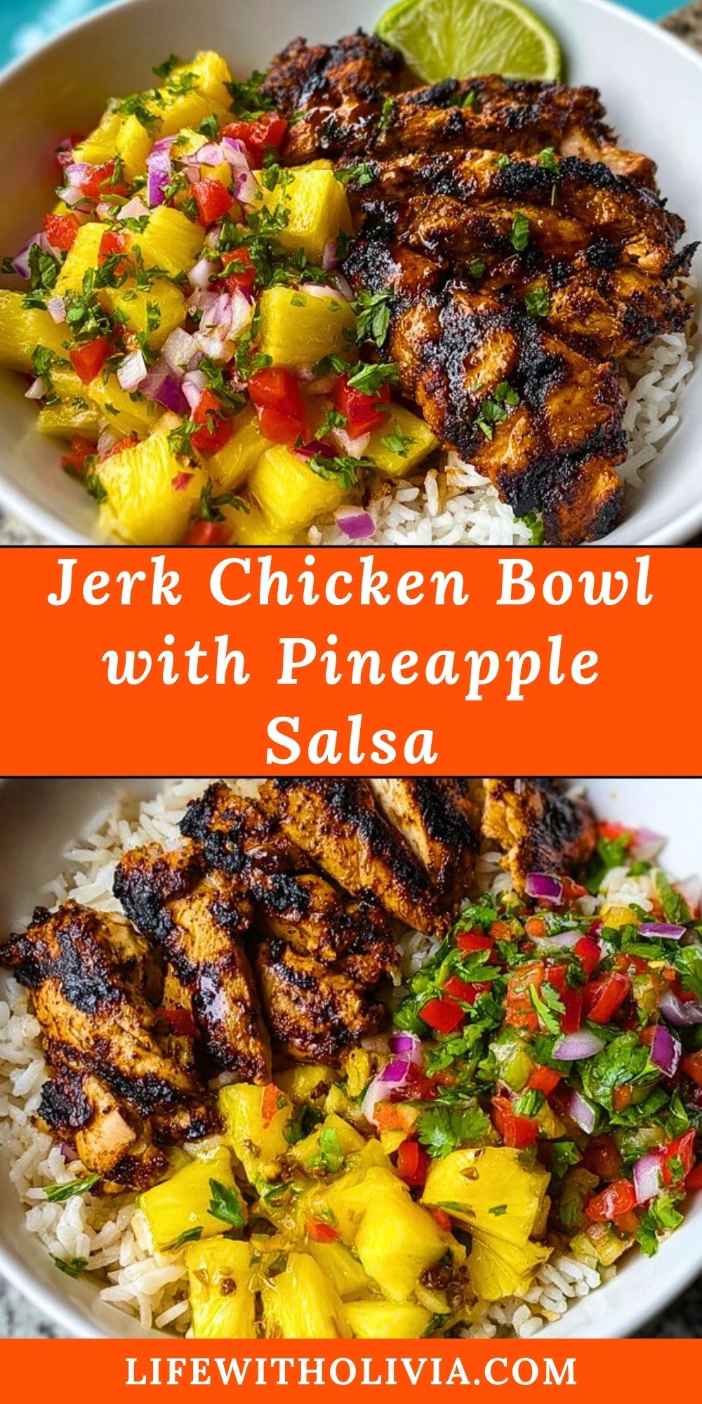 Keywords: jerk chicken, pineapple salsa, chicken bowl