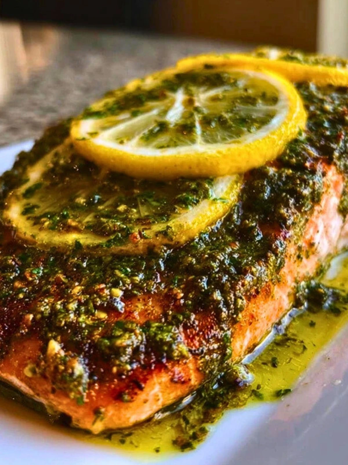 The magic lies in the combination of oven-baked salmon with vibrant green pesto. As it bakes, the pesto melts into the fish, locking in moisture and infusing every bite with garlicky, herby goodness. Lemon slices on top add brightness that cuts through the richness of the salmon for a balanced, mouthwatering finish.