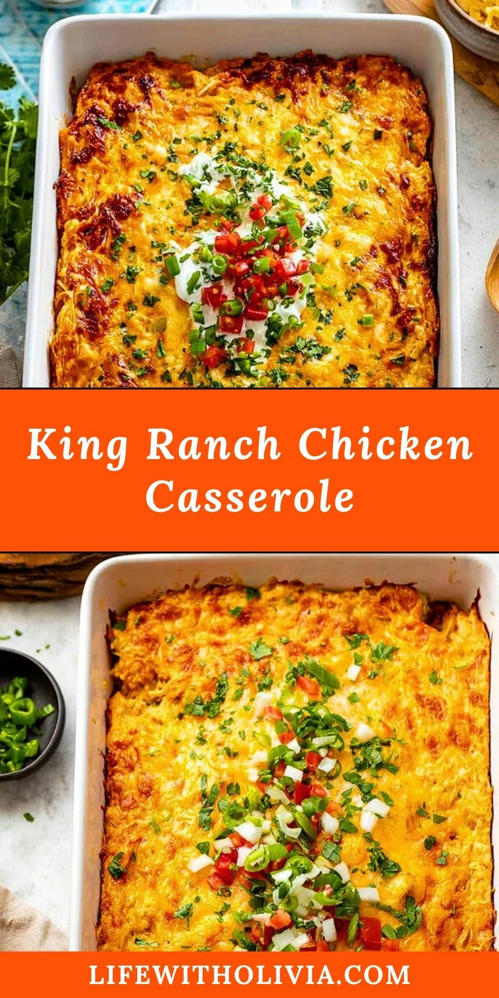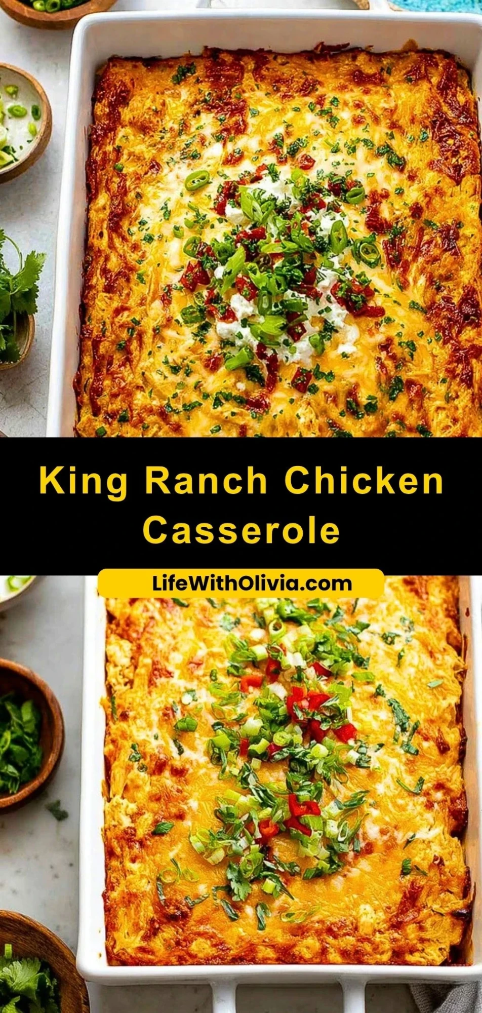 Once baked and golden, King Ranch Chicken Casserole is best served hot, straight from the oven. Garnish with fresh cilantro, chopped green onions, or a scoop of sour cream for a pop of color and contrast. Pair it with a simple green salad or roasted veggies to balance out the richness. For a Tex-Mex vibe, serve alongside rice or refried beans.