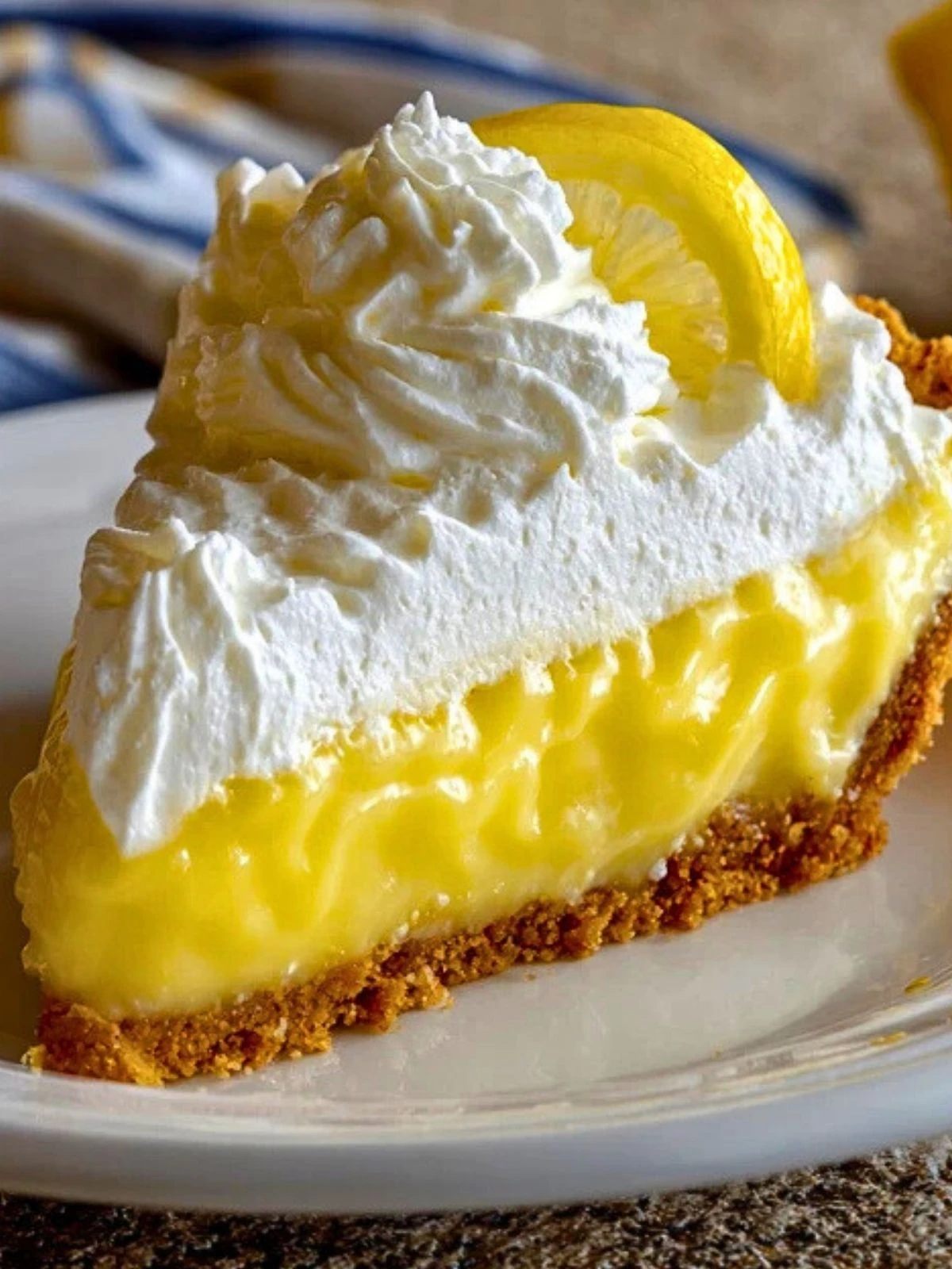 What makes this dessert stand out is the contrast of textures and flavors. The crisp graham cracker crust holds a luscious lemon custard filling, topped with airy whipped cream and a slice of lemon for garnish. It looks elegant without needing much effort, and the first bite instantly melts into a creamy, citrusy dream.