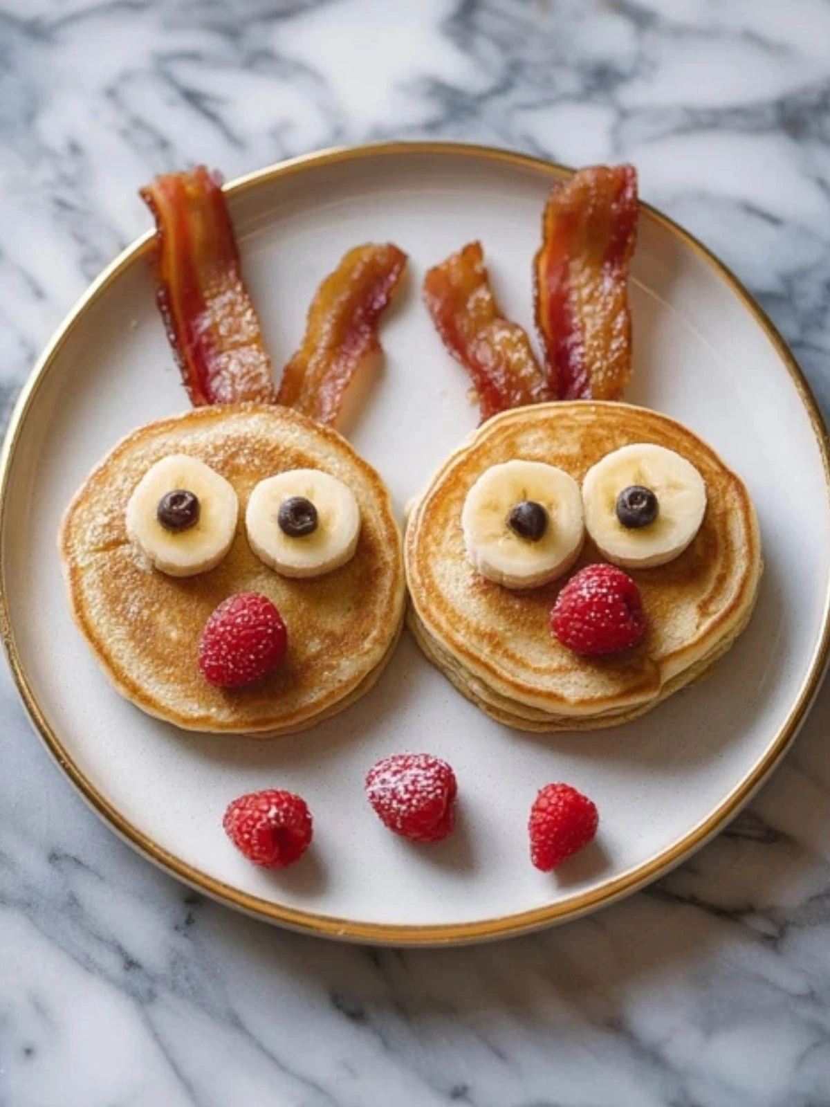 Tuck two bacon strips behind each pancake to look like antlers. If needed, you can secure them with a dab of syrup or tuck them under the pancake edge.