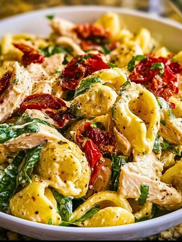 4. Combine tortellini, chicken, sun-dried tomatoes, and spinach in a large bowl. Pour dressing over and toss to coat evenly.