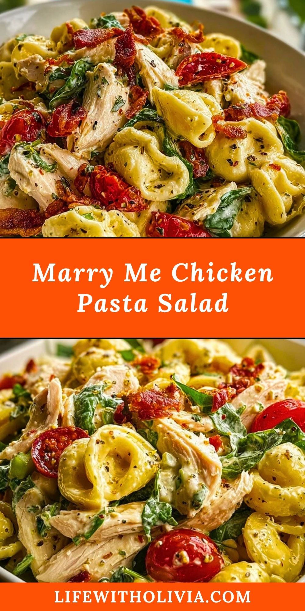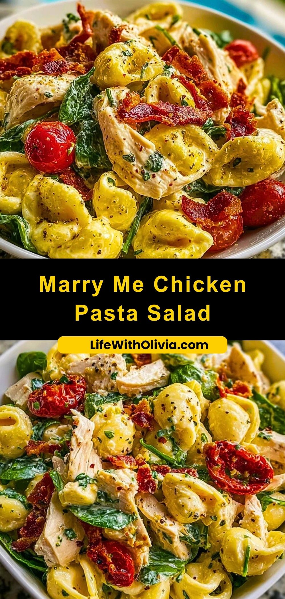 This creamy, dreamy Marry Me Chicken Pasta Salad brings together all the bold flavors of the viral “Marry Me Chicken” dish in a chilled, refreshing salad form. Tender chunks of seasoned chicken, cheesy tortellini, sun-dried tomatoes, and fresh spinach are tossed in a velvety, herb-kissed sauce that’s downright irresistible.
