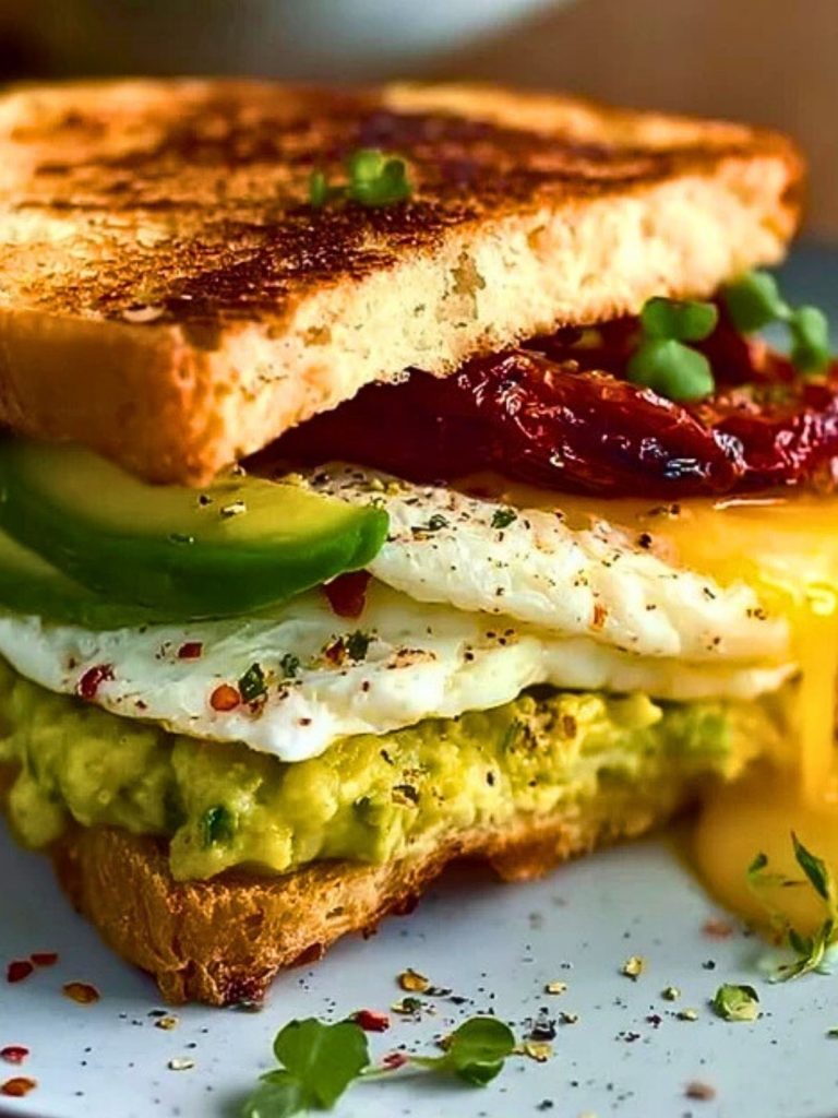 Savory, colorful, and irresistibly satisfying, the Mediterranean Breakfast Sandwich is everything your morning craves. It brings together the richness of smashed avocado, the creaminess of perfectly cooked eggs, and the bold, sun-kissed flavors of roasted tomatoes and herbs—all between two golden, crispy slices of toasted bread.