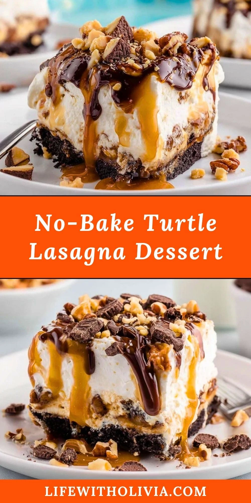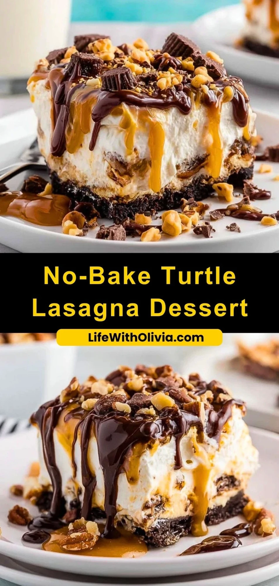 Keywords: no-bake turtle lasagna dessert, turtle dessert, no-bake dessert, easy recipe, dessert ideas, party dessert, holiday dessert, chocolate caramel dessert, make-ahead dessert, food ideas